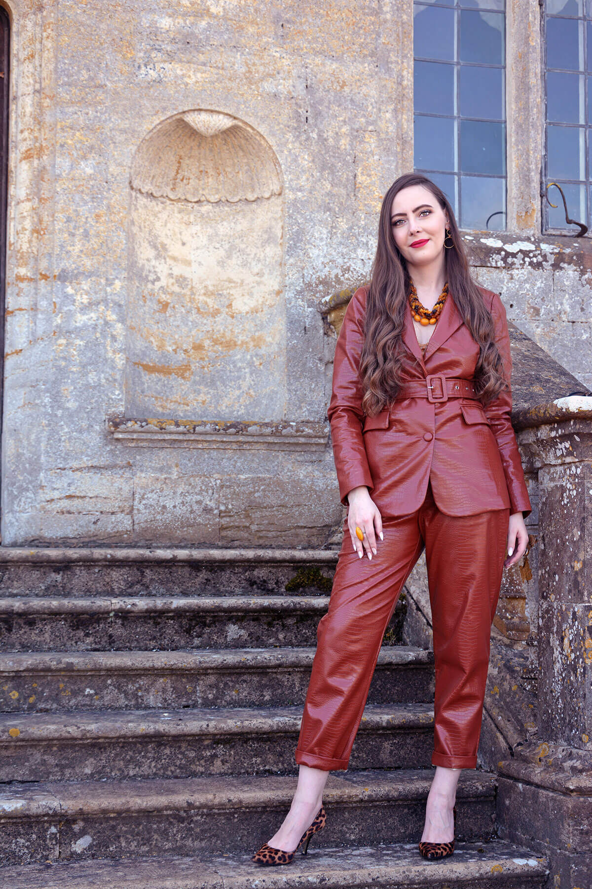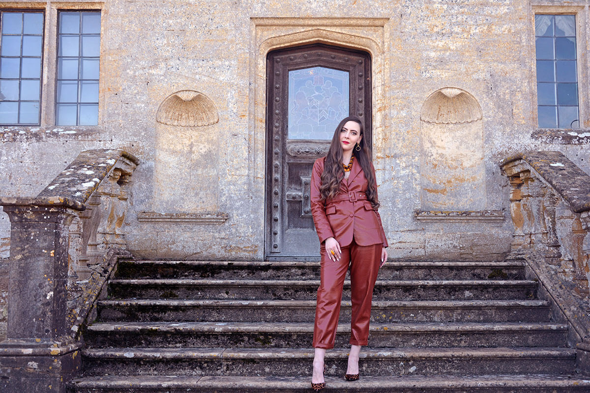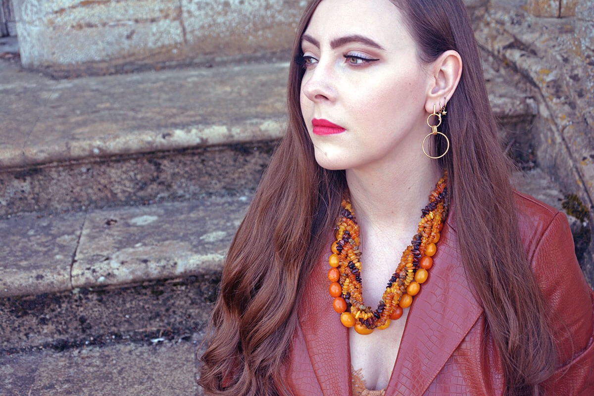 I have always been very careful with amber. I feel amber has a very strong resemblance to me. You see, we both have only two modes. I either look like a troubled teen in a tracksuit or photography ready. In the same way, amber jewellery is either so ultra modern, it almost looks experimental, or so traditional and old-fashioned, it may be best to leave it in your grandma’s jewellery box. I felt it was my mission to break this mental limit I had with amber, and find an in-between. This is why I styled my amber pieces with an edgy full leather-look suit.