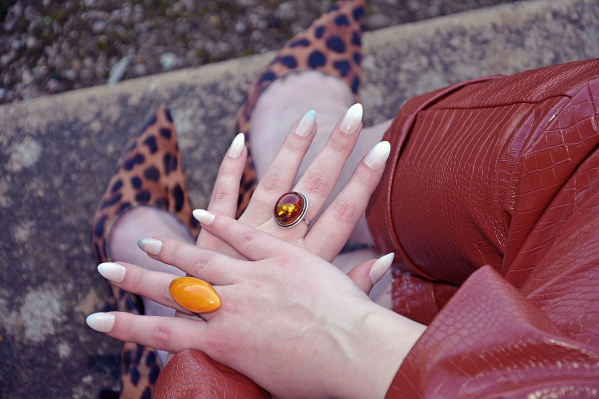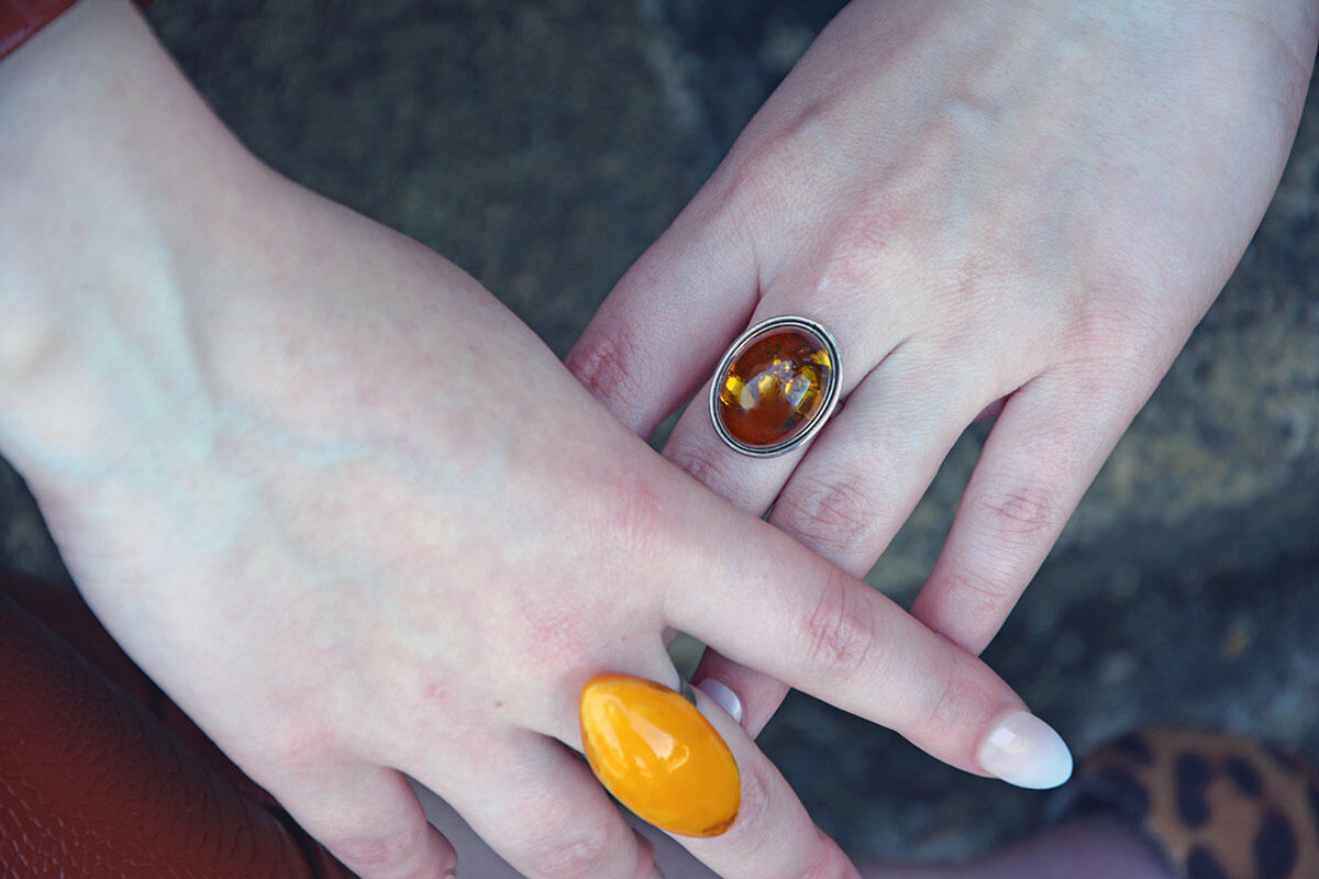 Taking our history hat off, it’s time to pop our lab coat on and talk about the characteristics of amber as a gemstone. It scores a very low 2-2.5/10 on Mohs scale of hardness. This means that amber is a very weak gemstone that can easily break, chip or be damaged. It can also dissolve in alcohol and acetone among other harsh chemicals (although this will take an extended period of time), so definitely be careful when cleaning amber that is set is silver and gold. The trick here will be to clean the metals gently without touching the amber attached with the same chemicals. This gem is also flammable – our ancestors have used amber for light instead of wax as it has a very long burn time. But this also means that you should always take your amber rings off when cooking or if you’re next to a fireplace or stove.