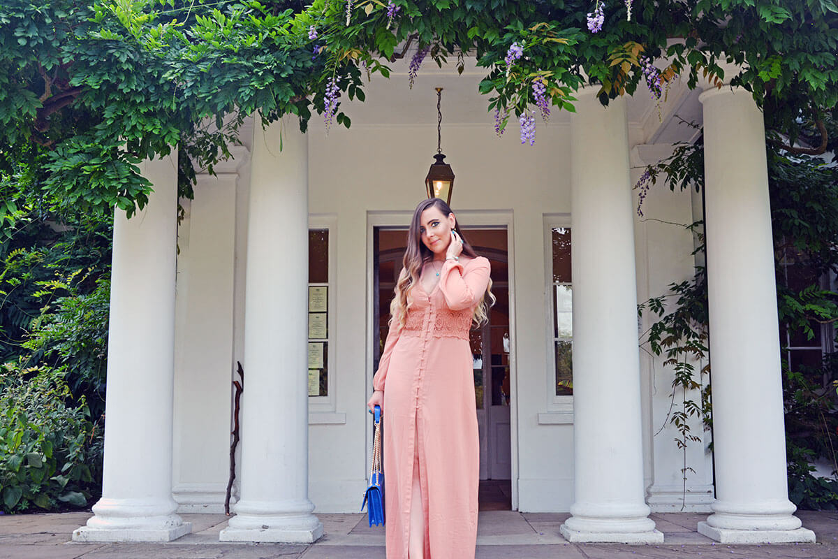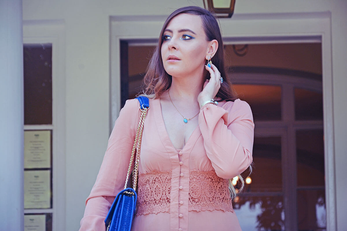Dress: Boohoo, Bag: Versace, Heels: ASOS, Necklace: Gold + Turquoise, Ring: Silver + Turquoise, Bangle: Silver + Larimar, Earrings: Silver + Dark Opals, Ring: Silver + Aquamarine