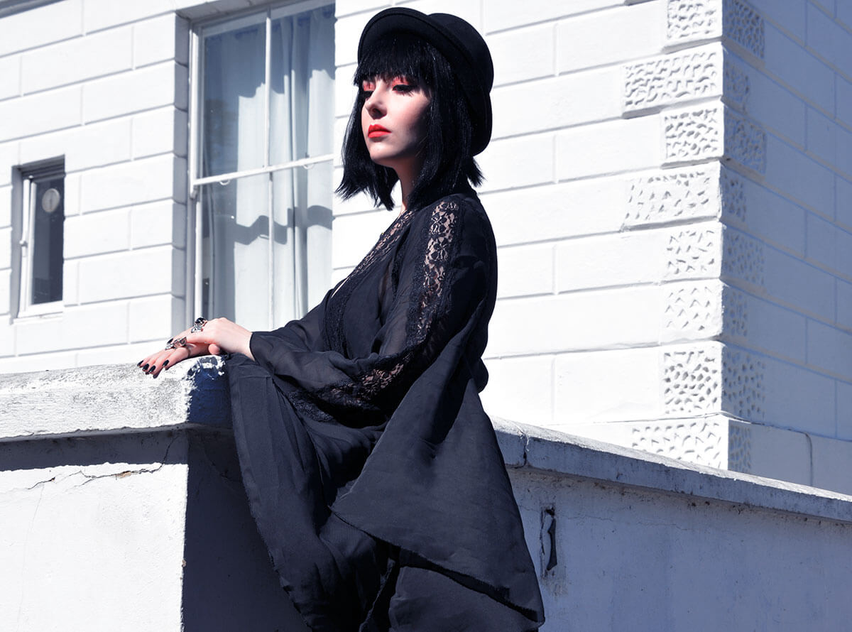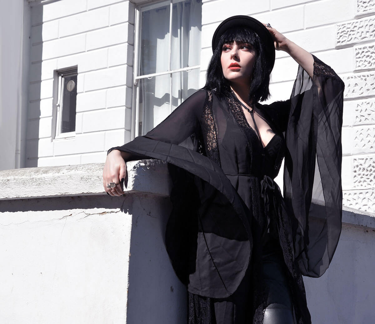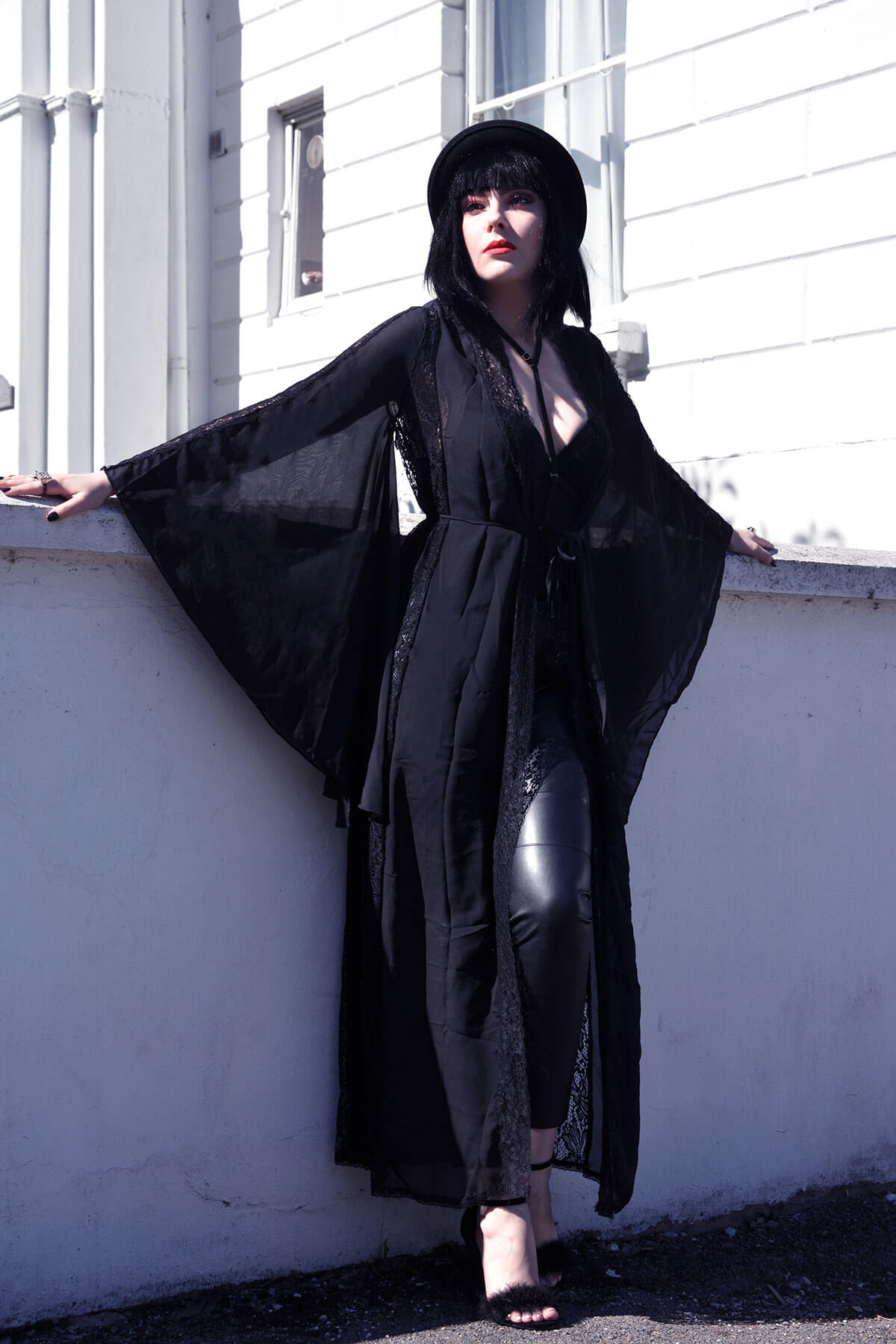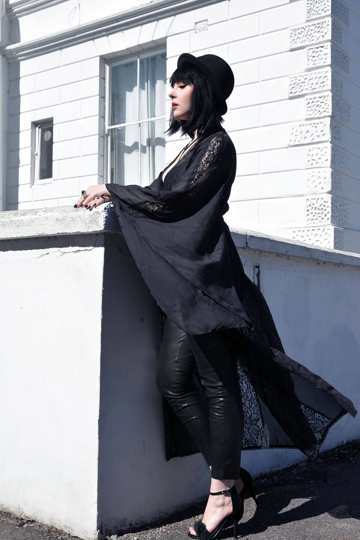 Gorgeous leather, and the dramatic kimono is such a light whisper of black, almost like a shadow! Love the lace detail, and shoe and the hat,