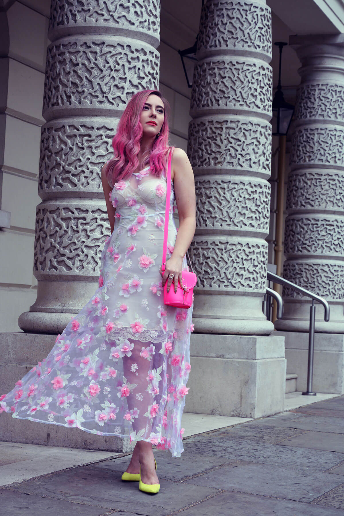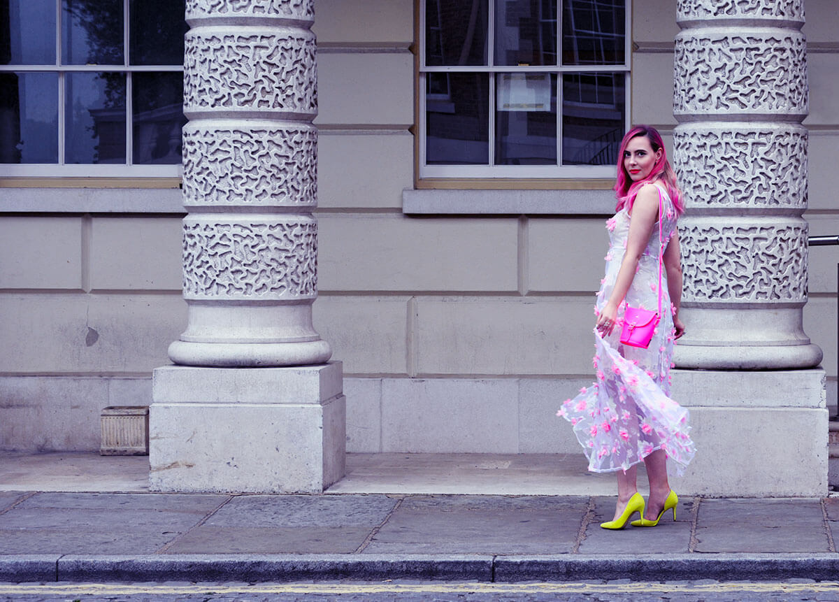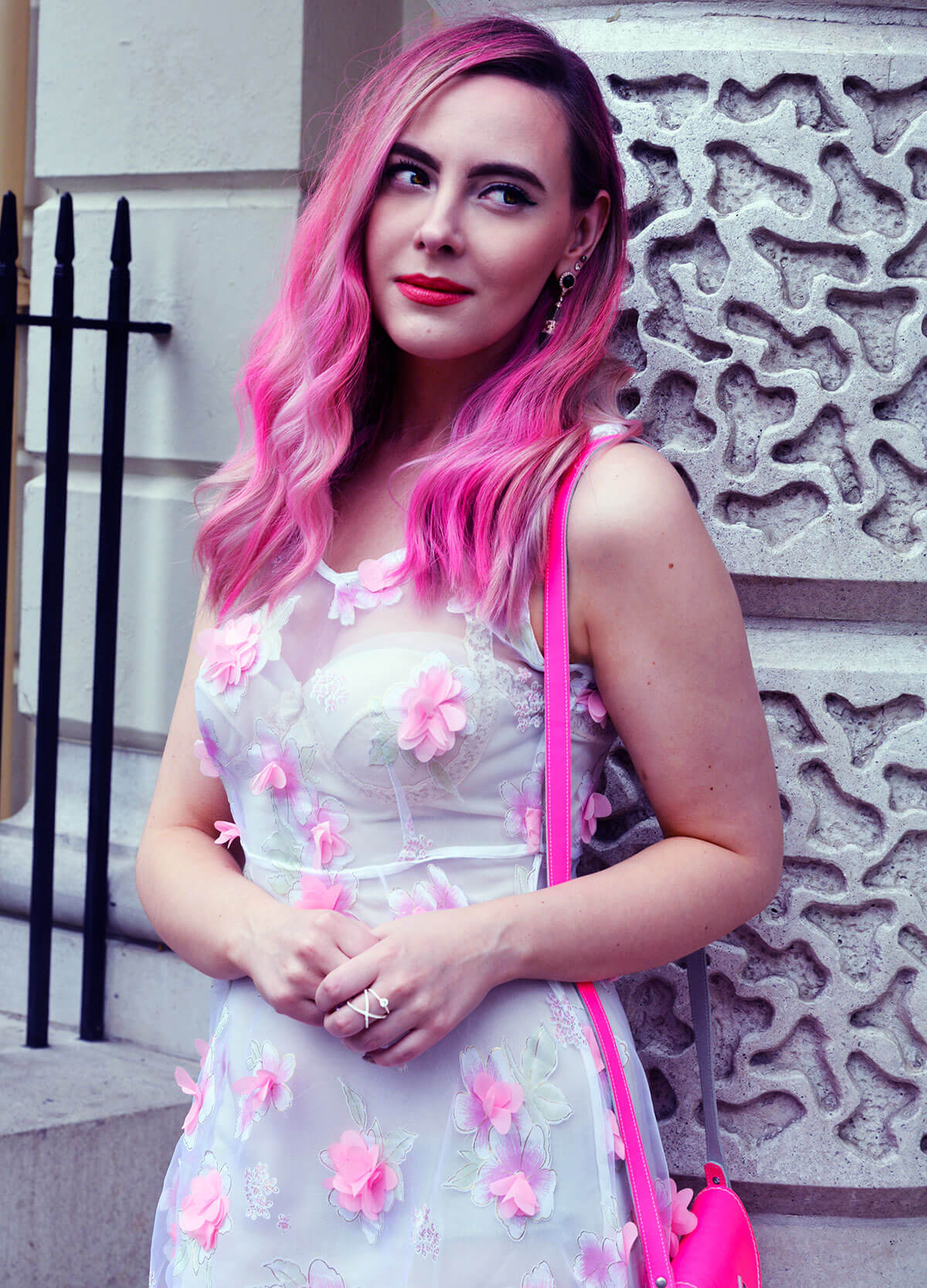 You are such a vision and I love the pink hair. The details on that dress! And that bag….gimme gimme!