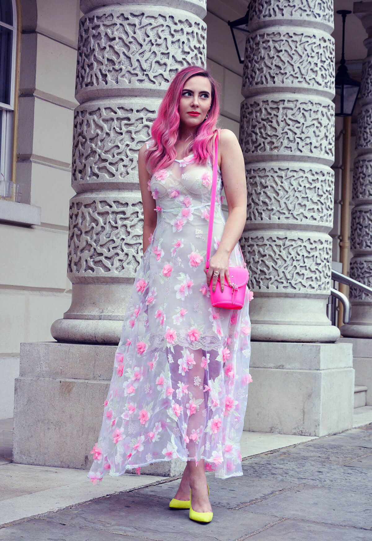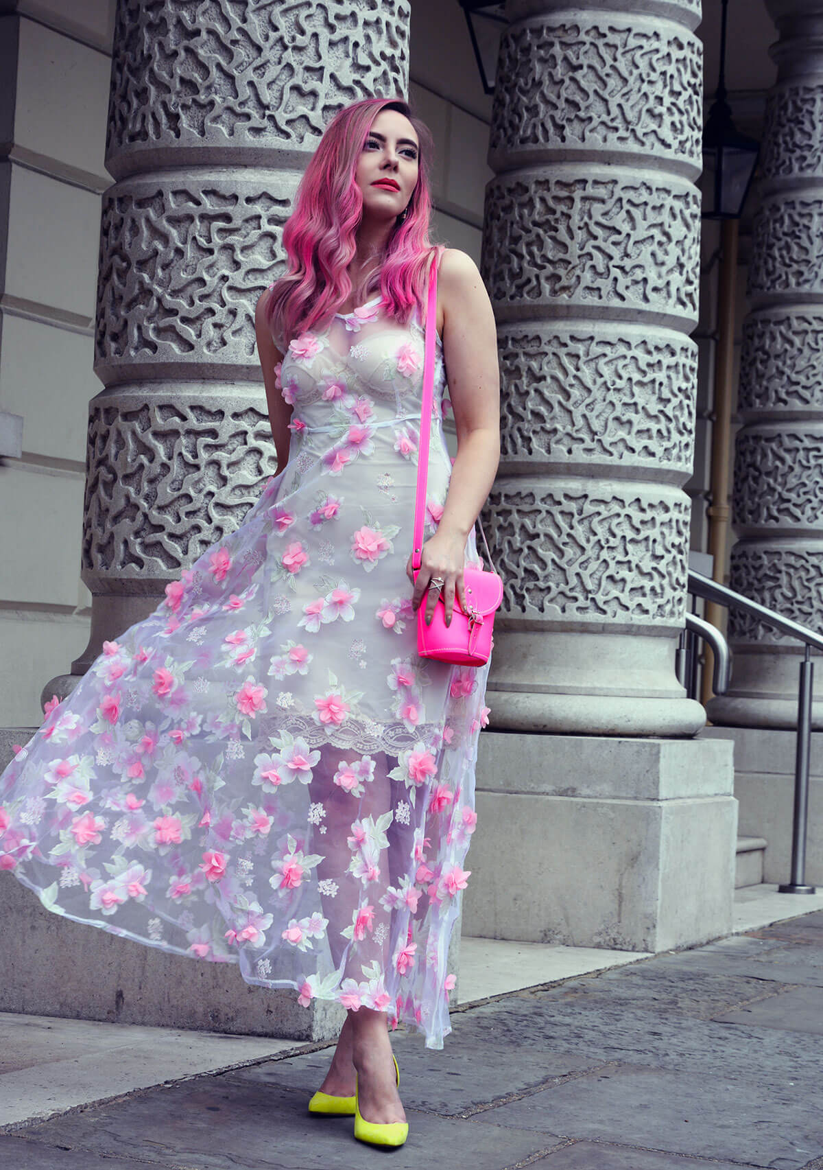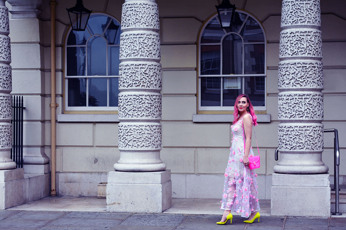 You are such a vision and I love the pink hair. The details on that dress! And that bag….gimme gimme!