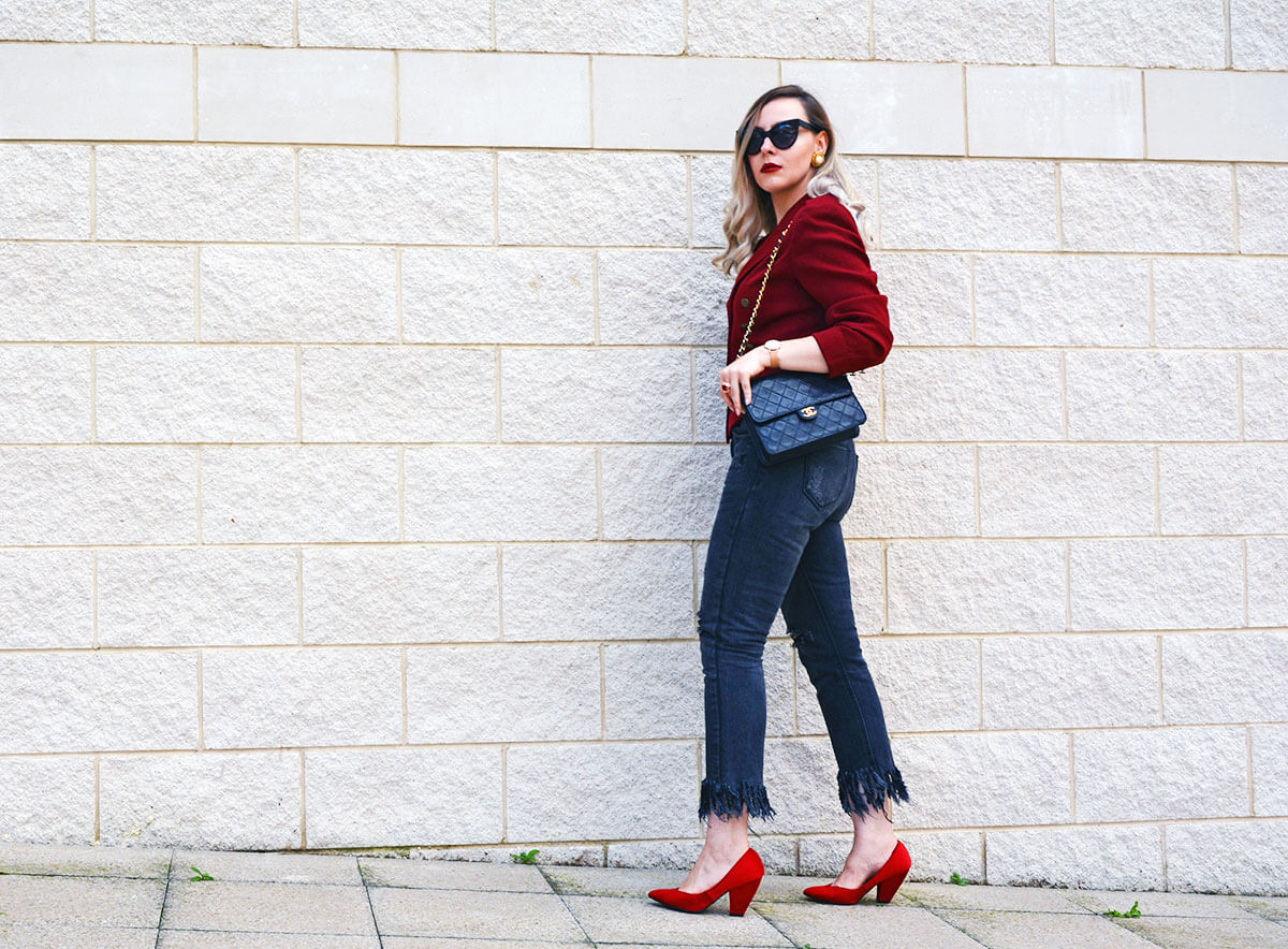 Blazer: Moschino, Denim: c/o Tobi, Bag: Chanel, Pumps: Marks and Spencer, Sunglasses: AND/OR