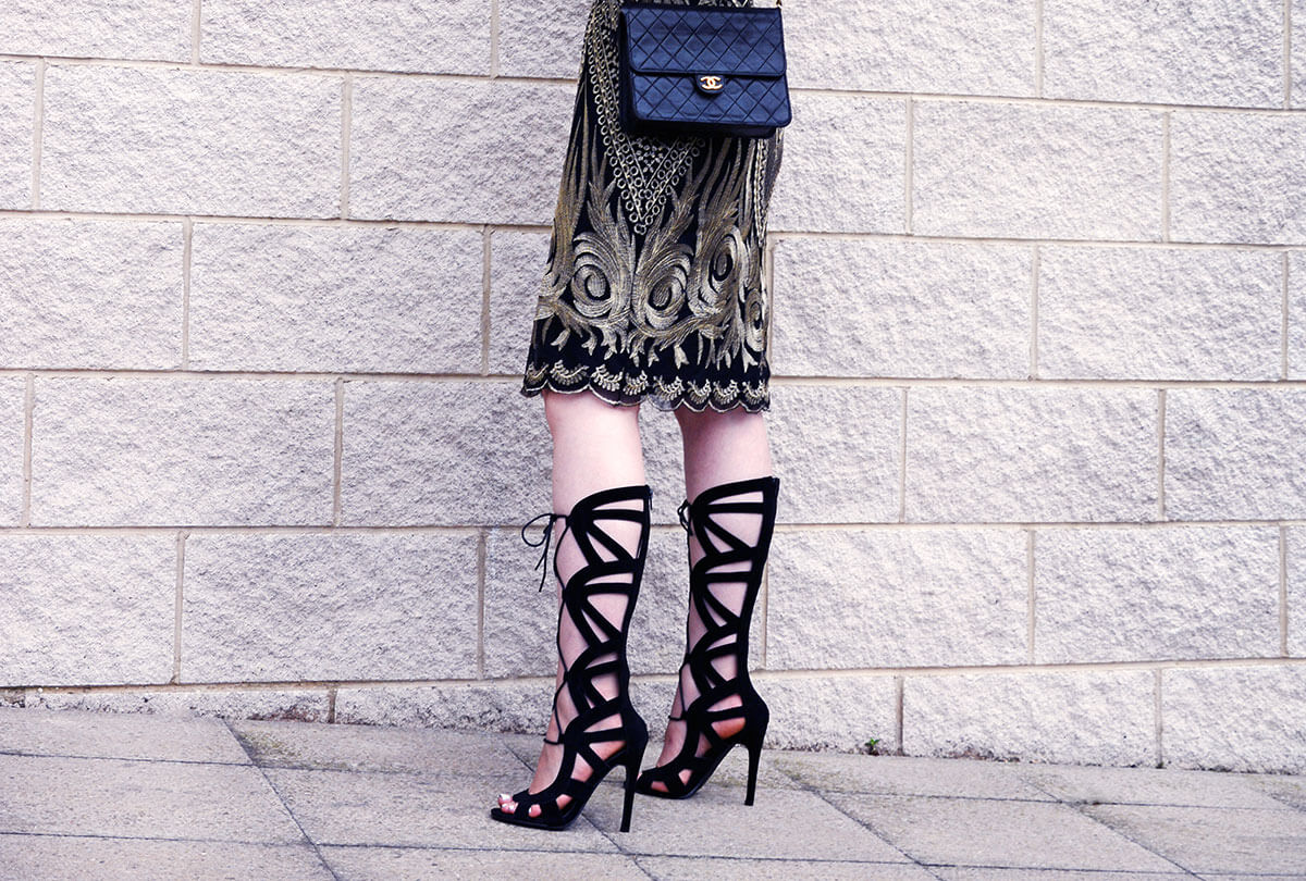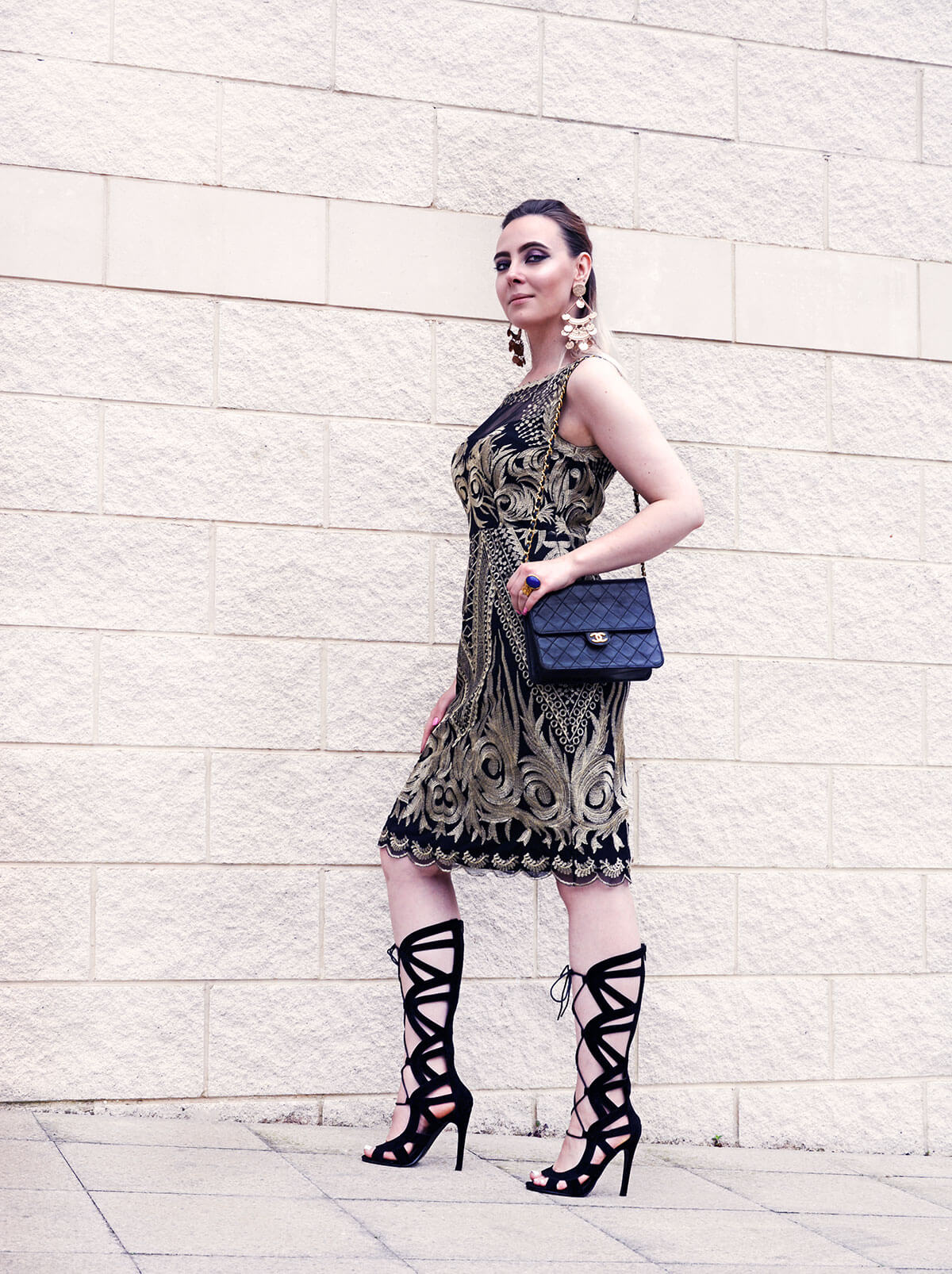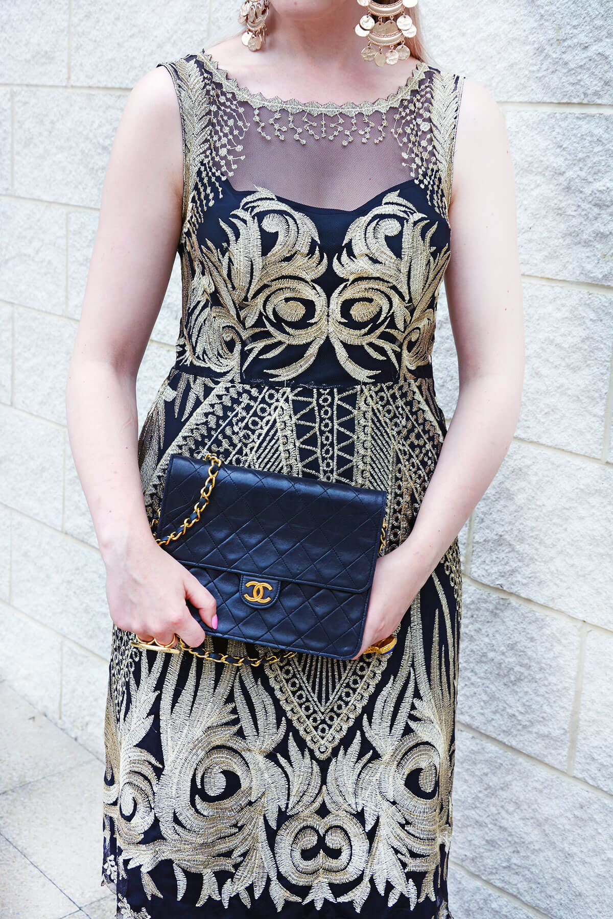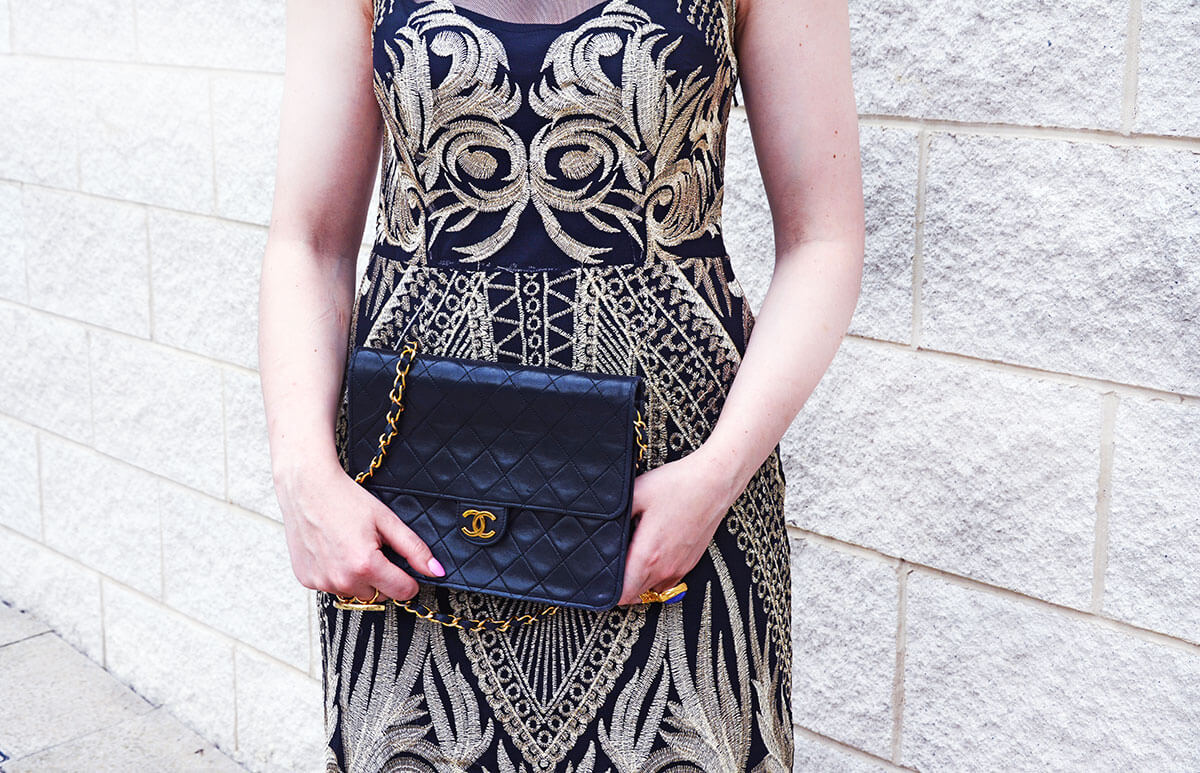 Dress: Kaleidoscope, Heels: Boohoo, Bag: Chanel, Earrings: Kenneth Jay Lane