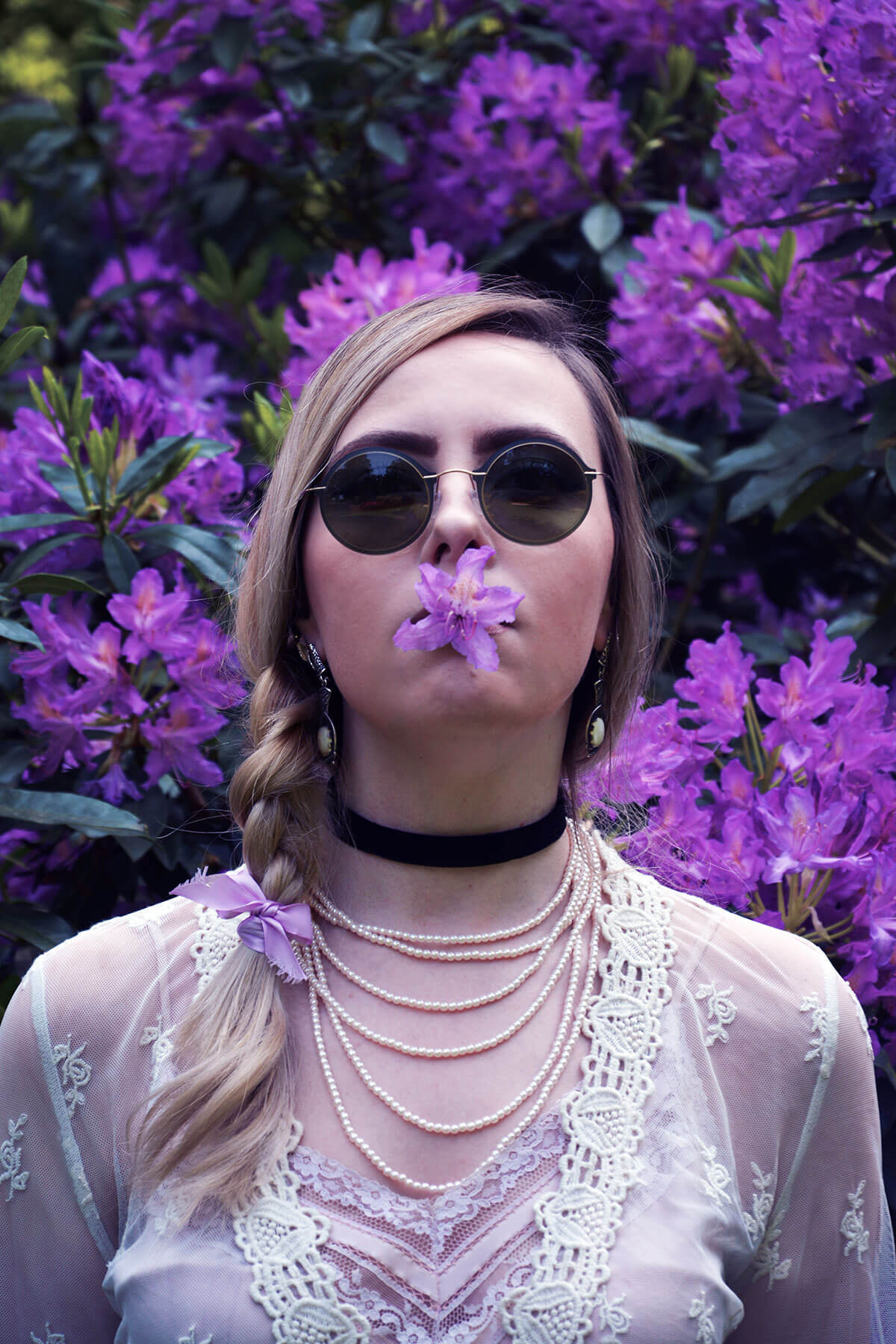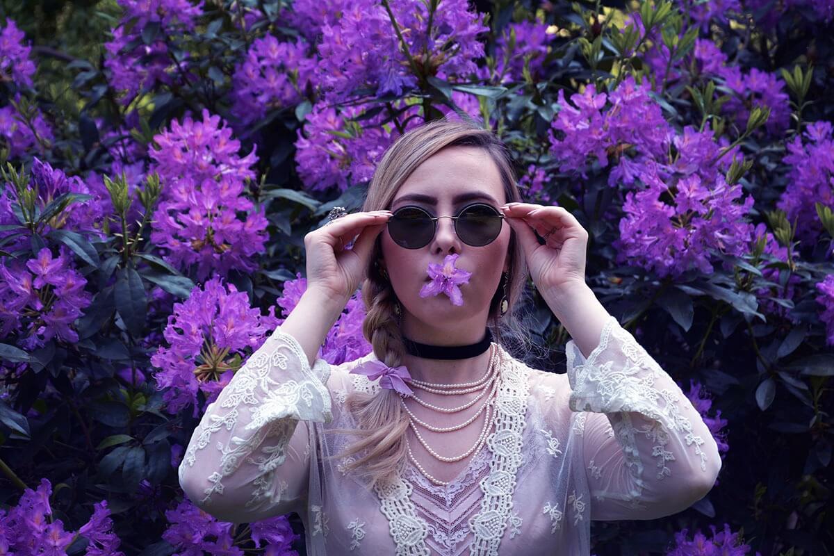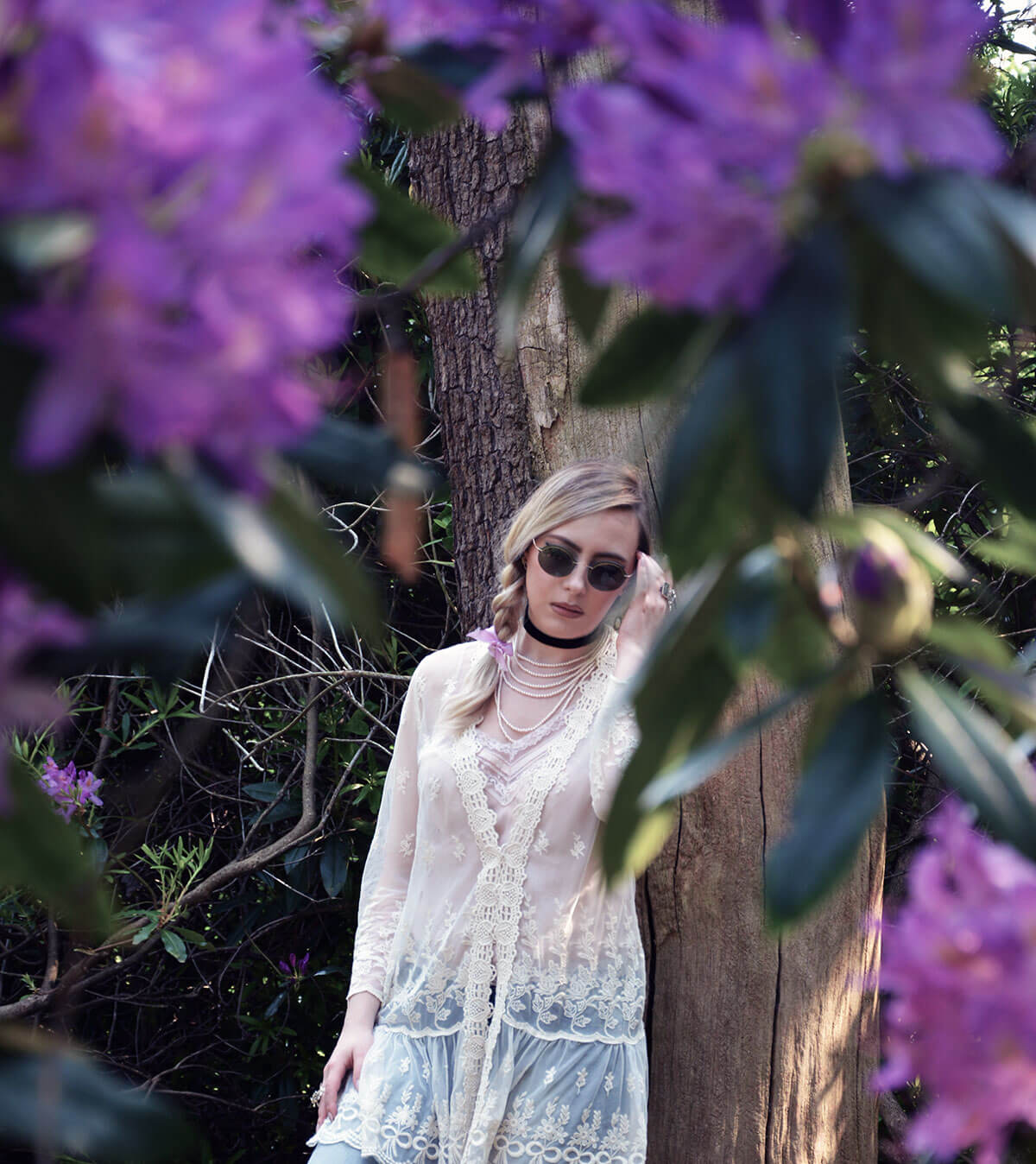 Such beautiful and elegant photographs! I love the purple florals, they make a beautiful backdrop to compliment your outfit.