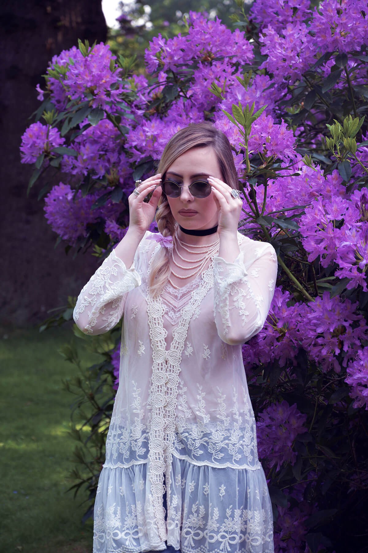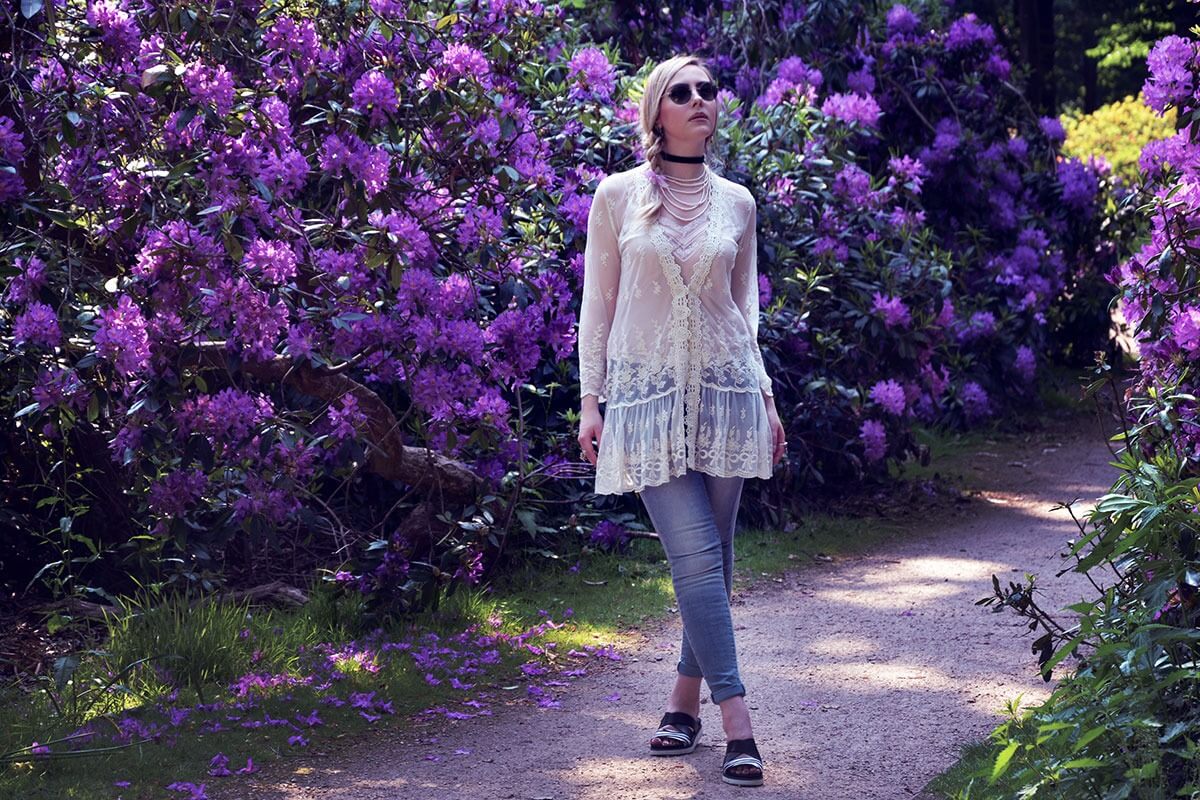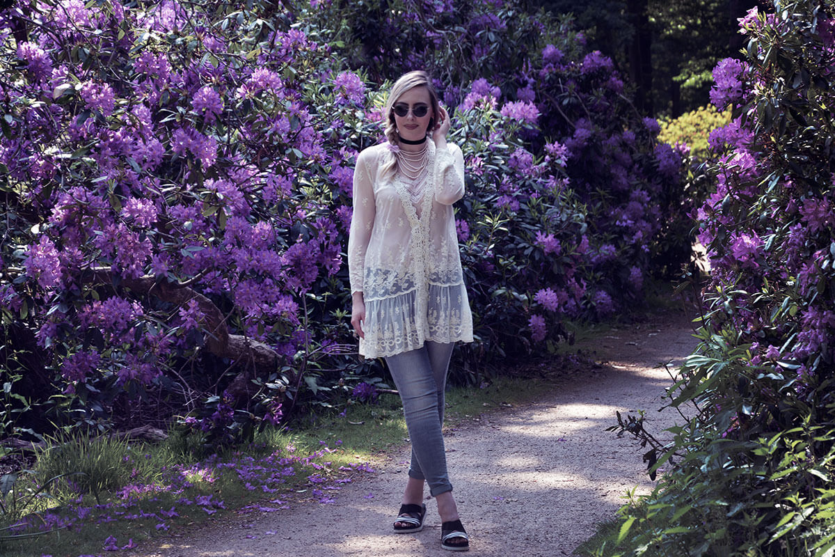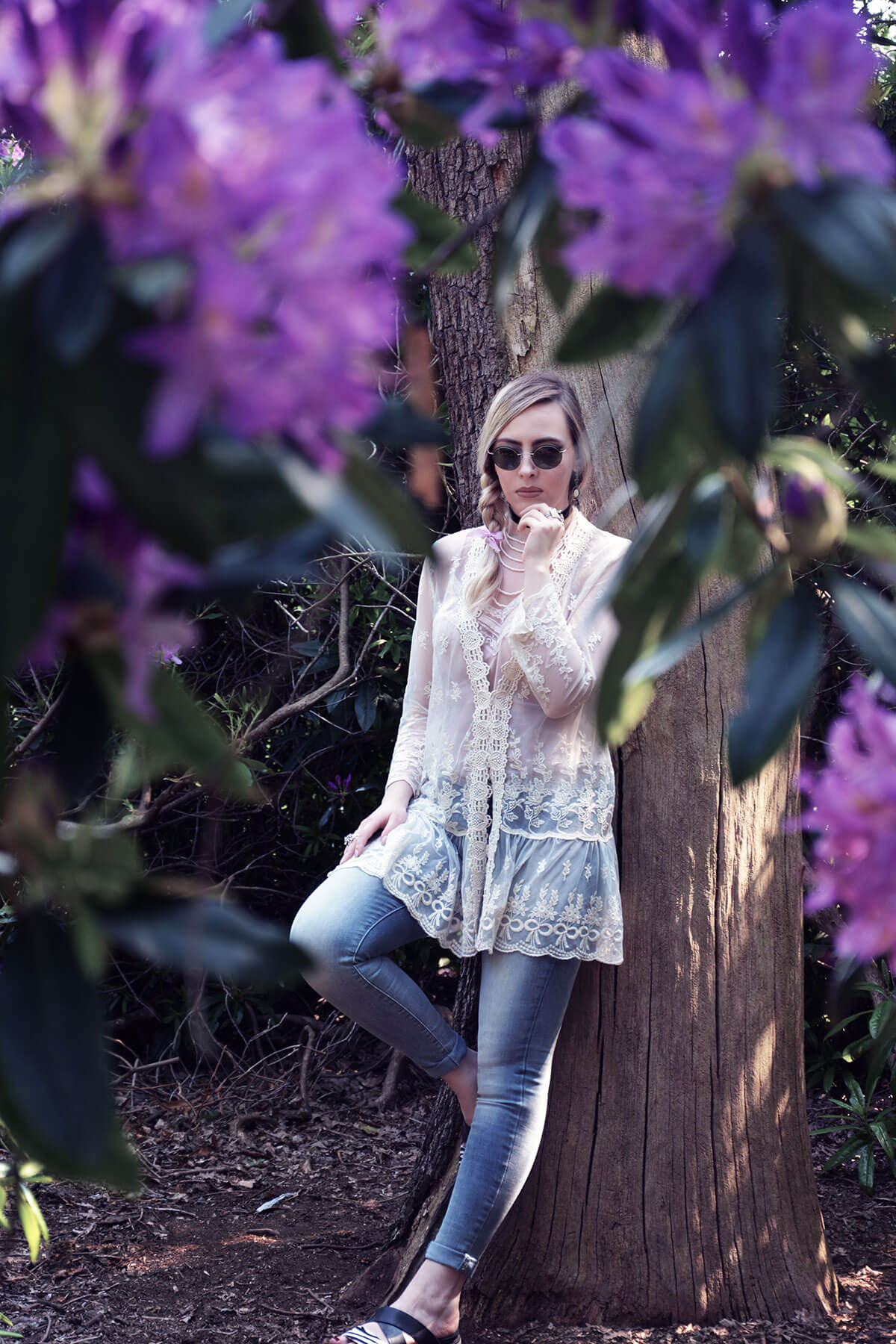 How fabulous you look in the floral garden. Love the pearls and lace tunic over your denim. Those are great looking “ugly” shoes! Stunning post, as always!