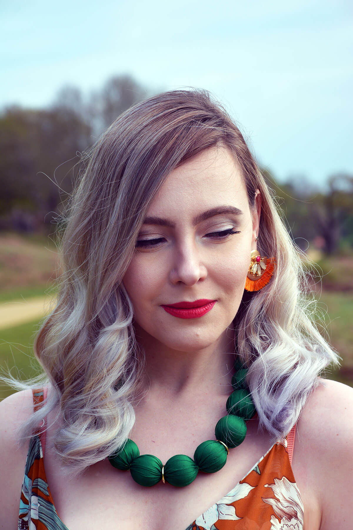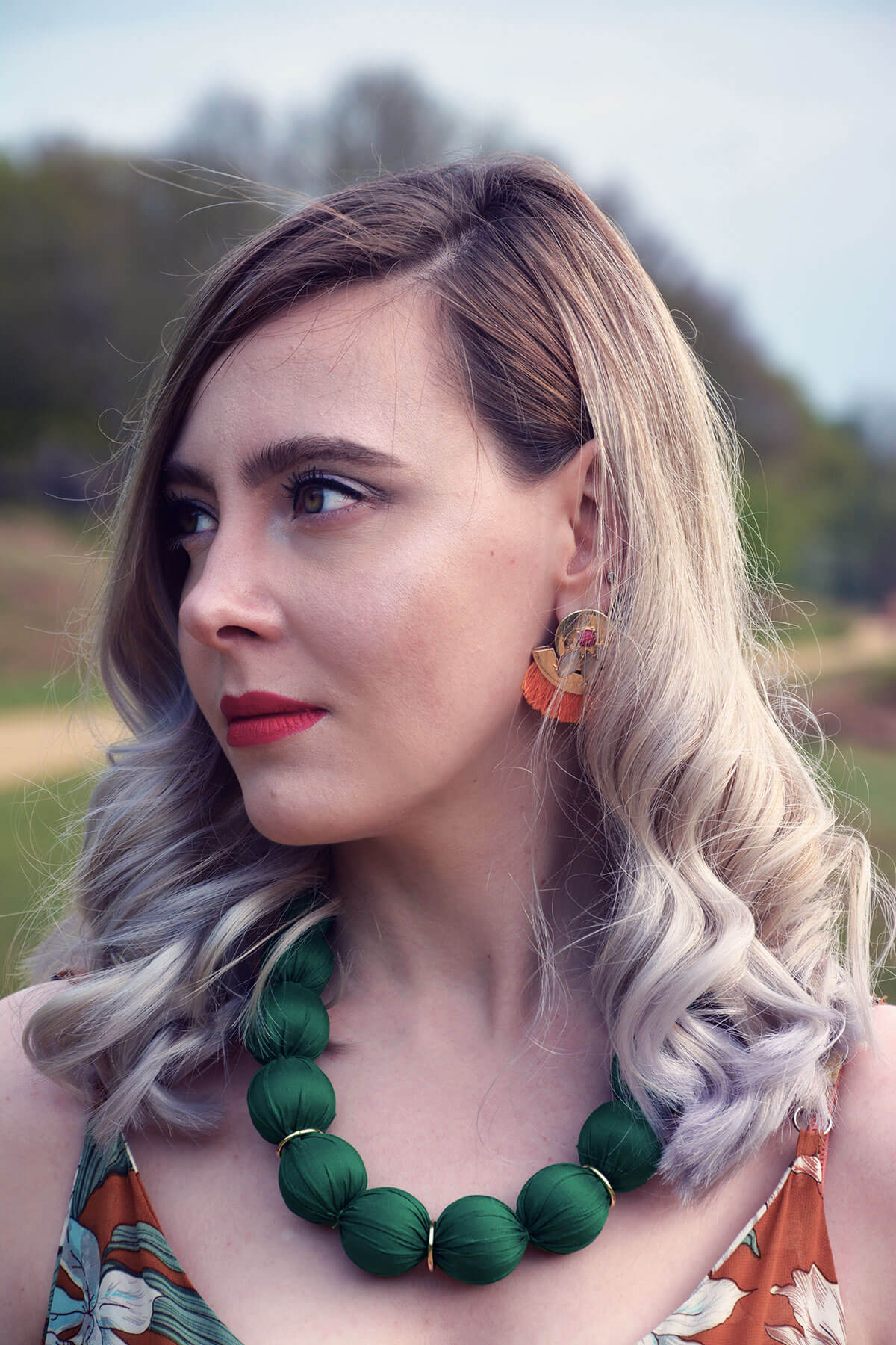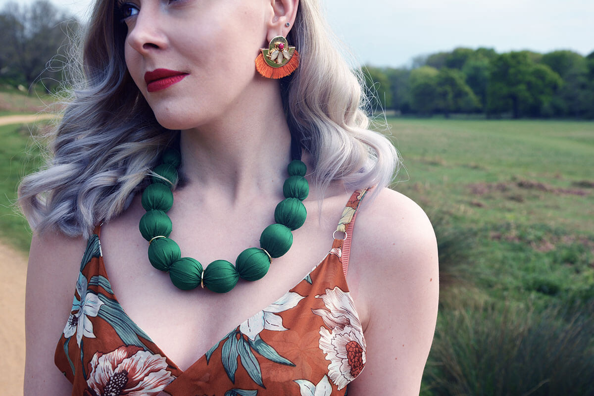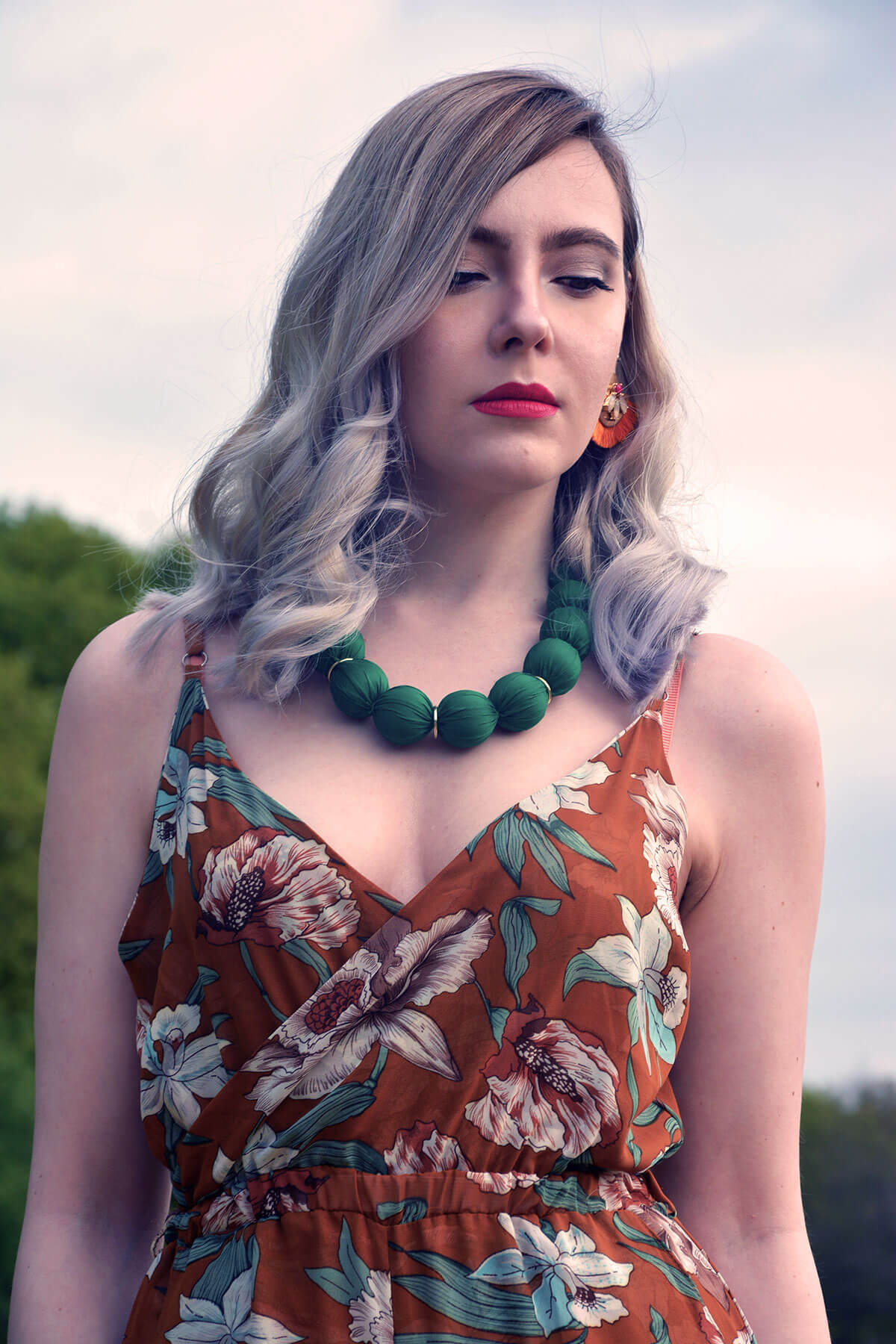 The jumpsuit is emphasised by this spectacular necklace by Swedish designer Hanna Altmann. I had the pleasure of wearing a turquoise version too. What I have learned about it is that it’s an amazing accessory whatever the colour. Hint – it comes in every shade you can imagine. 🌈