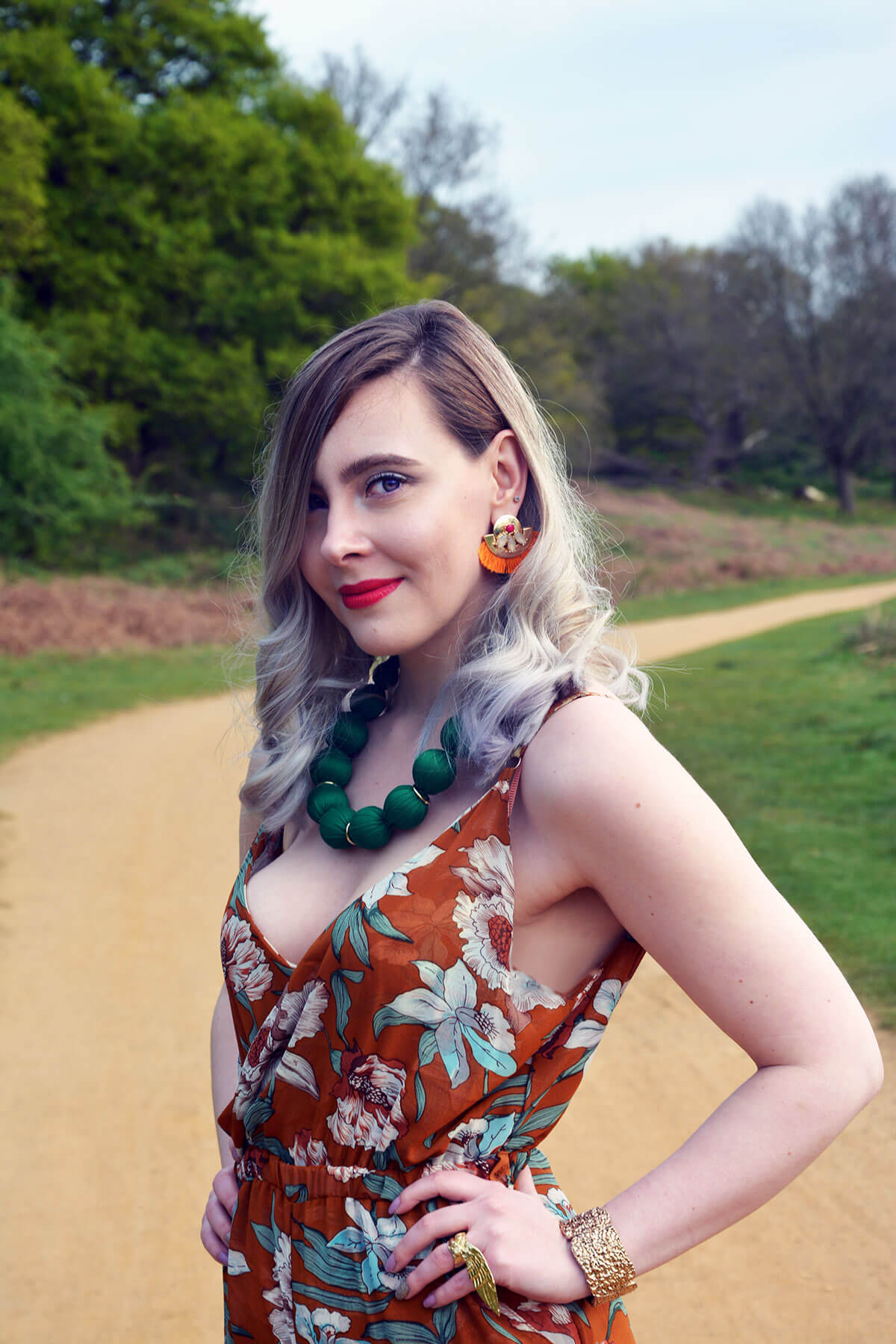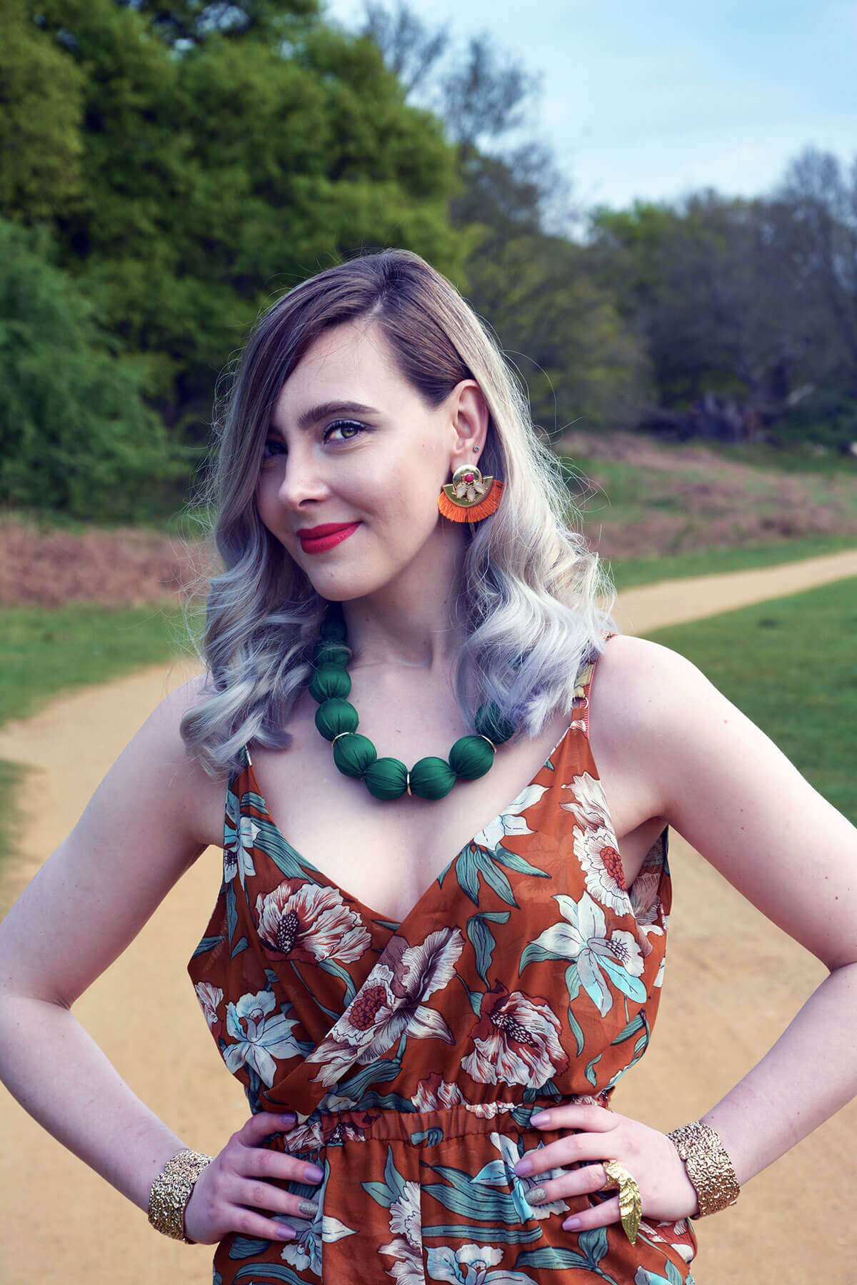 I love the sporty floral jumpsuit on you. It does feel like the essence of spring. I also adore your bold assessories . Especially that necklace. Have a wonderful week !