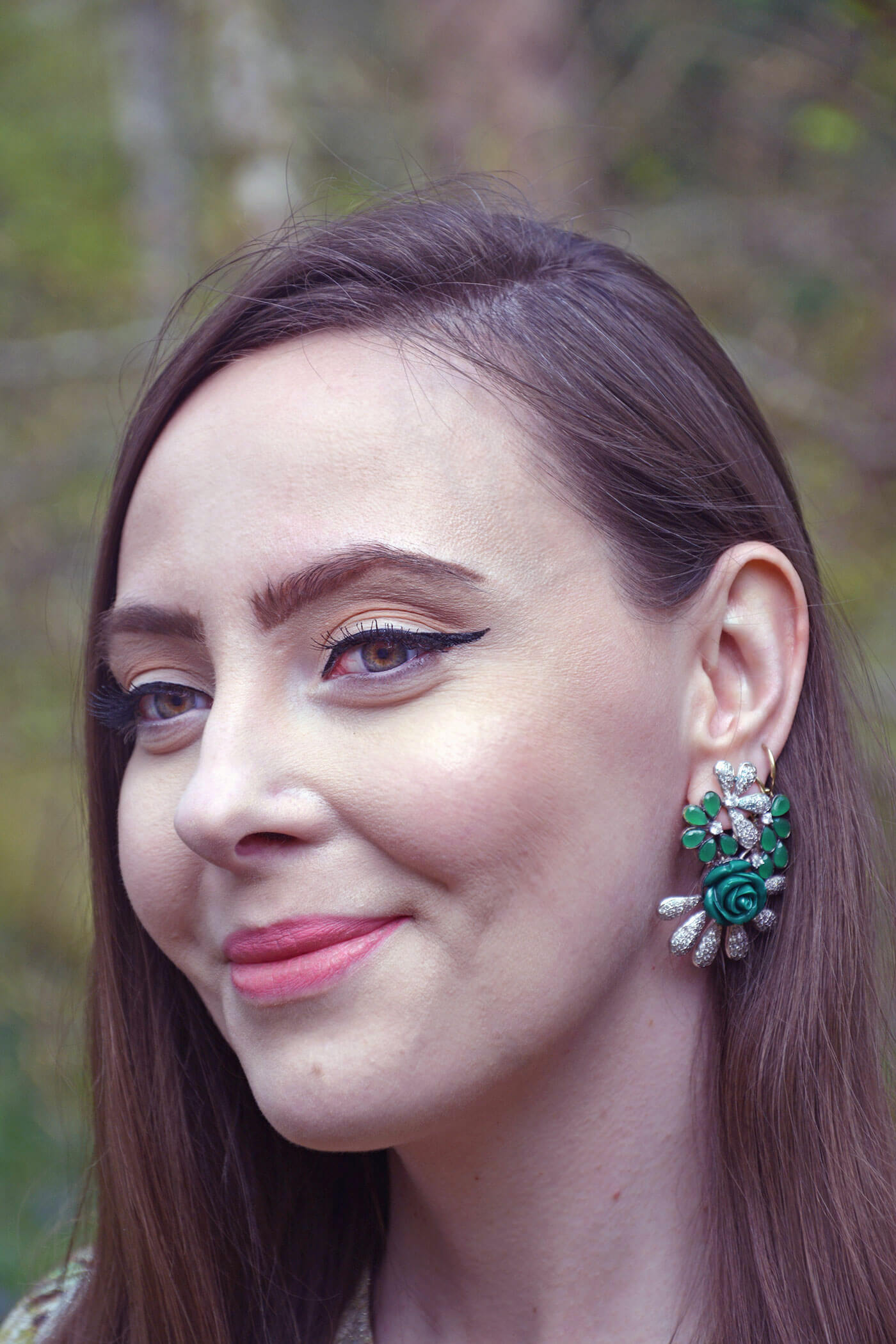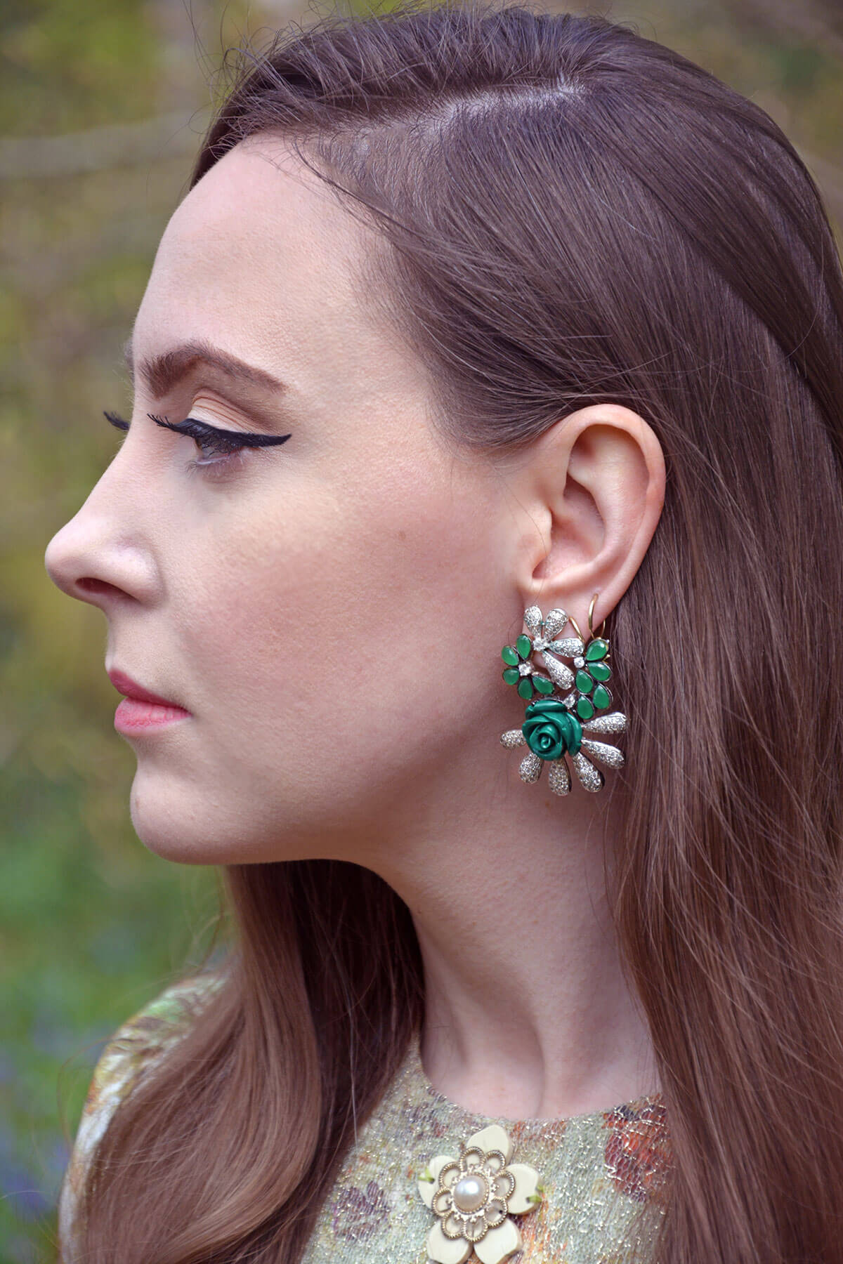 In the images I am wearing a sterling silver pair of earrings, set with cubic zirconia and green ceramic roses.