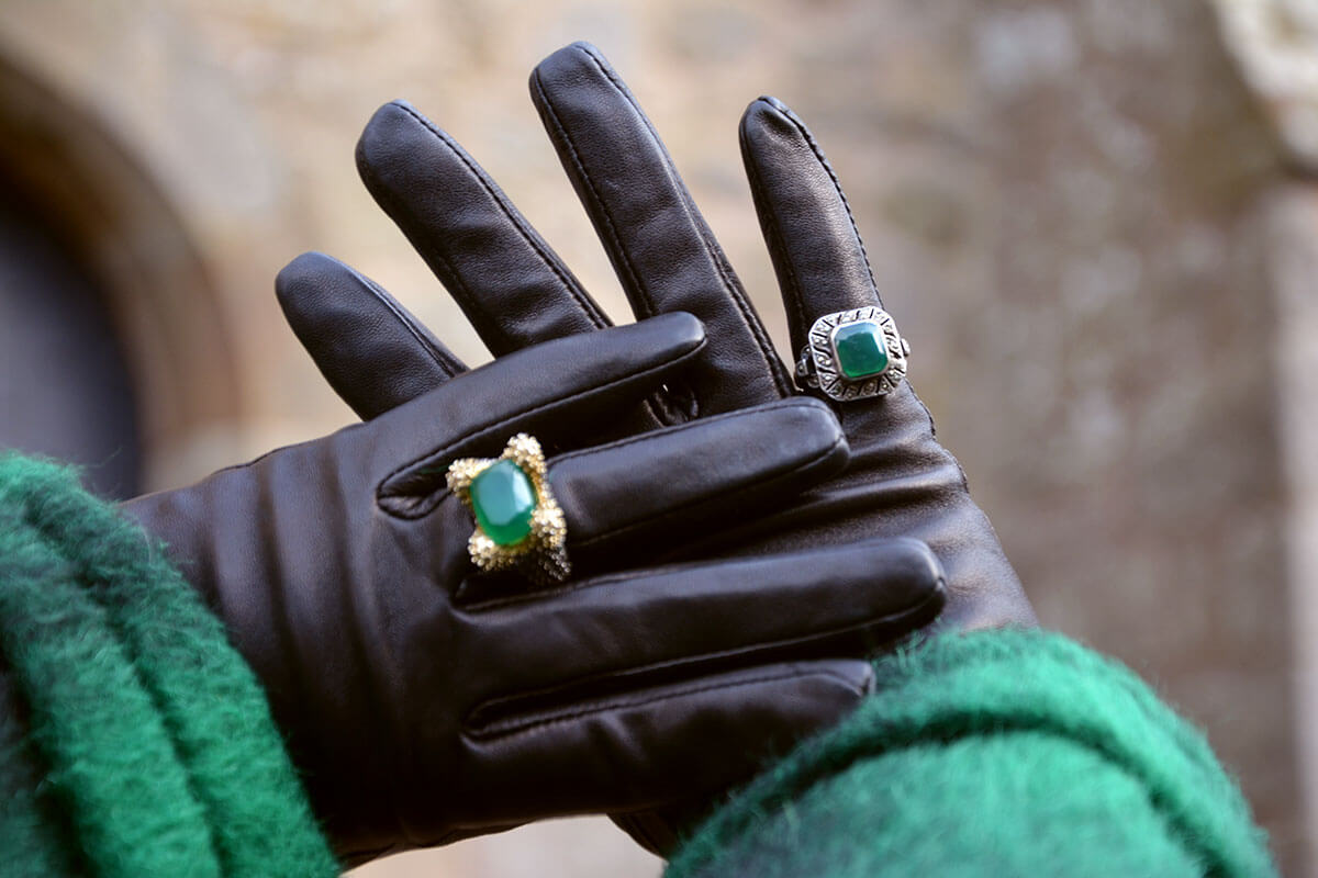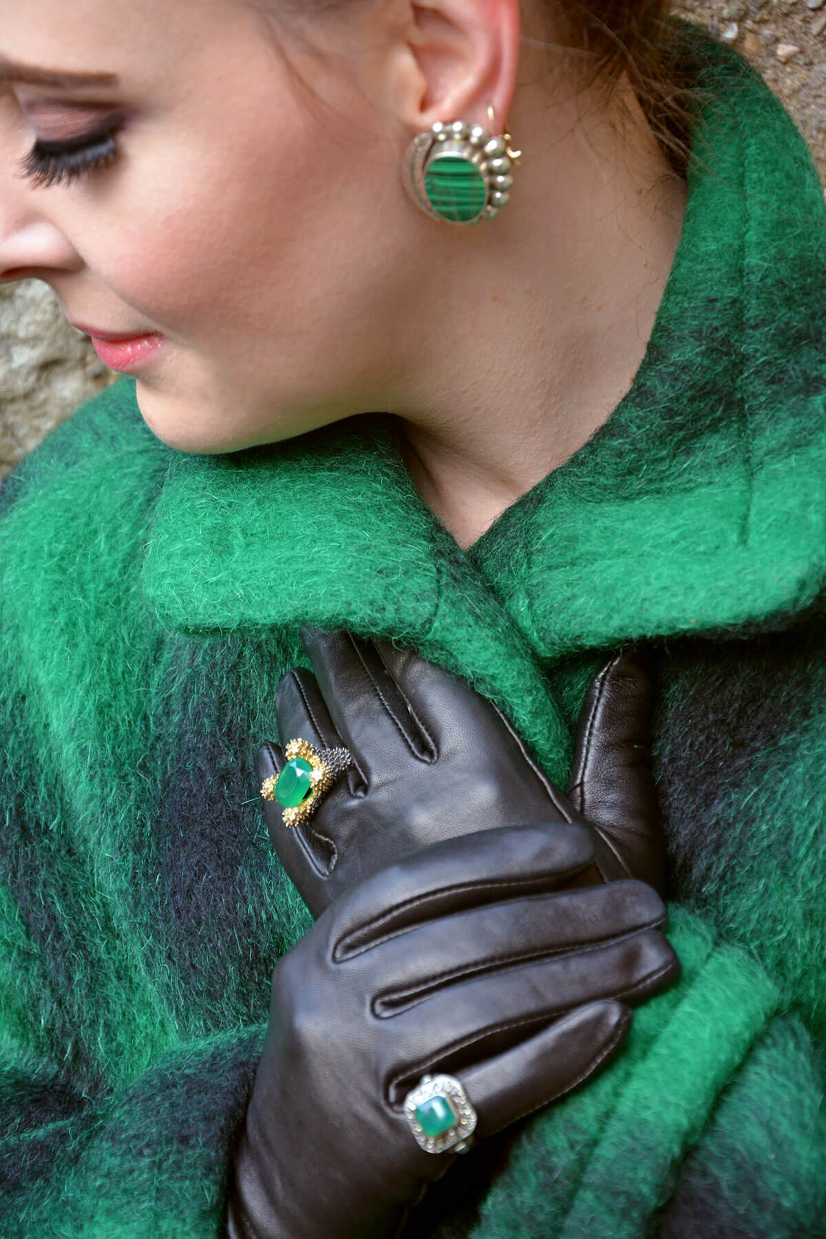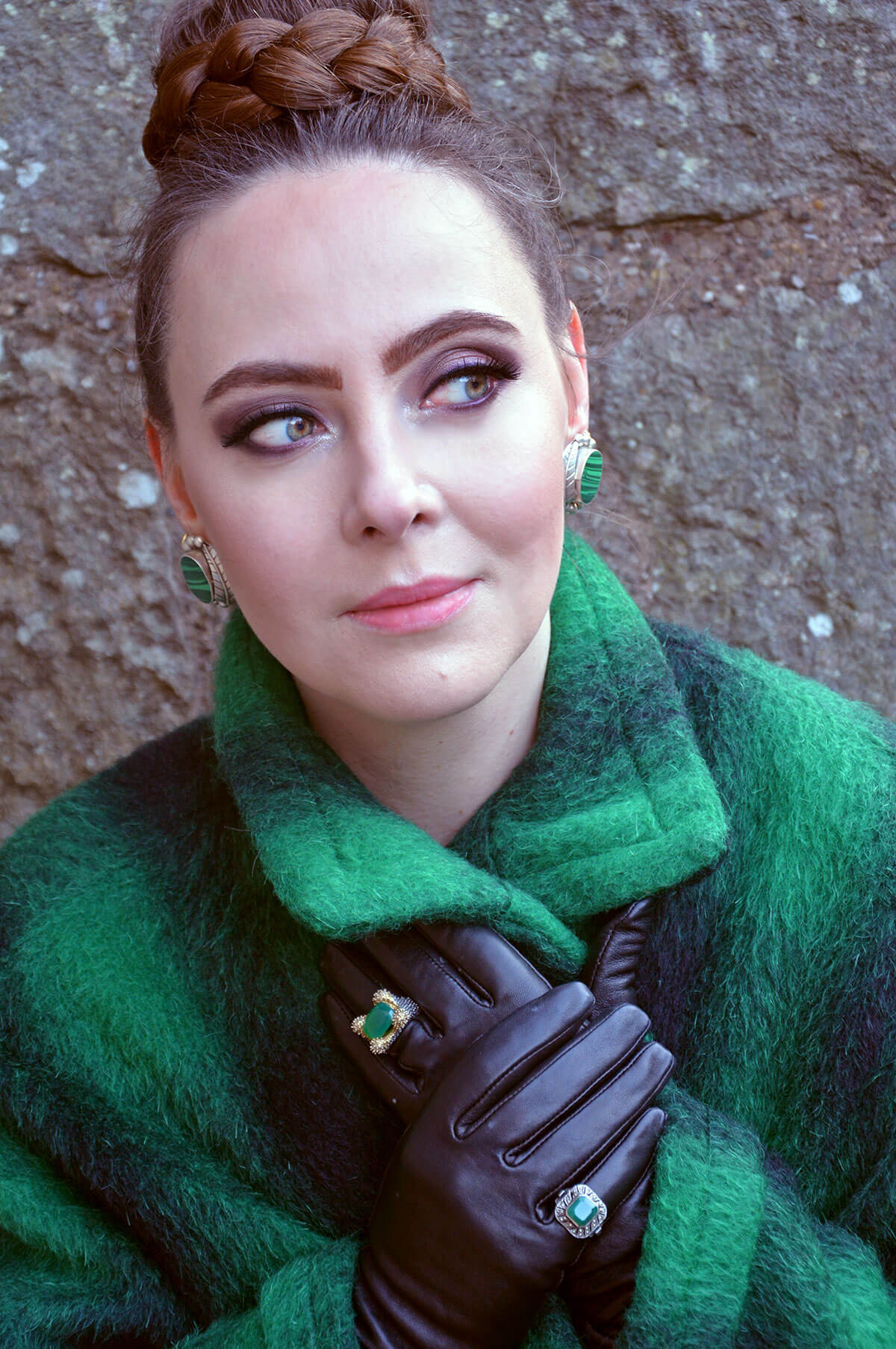 In the images I am wearing malachite earrings, chrysoprase and green agate rings.
