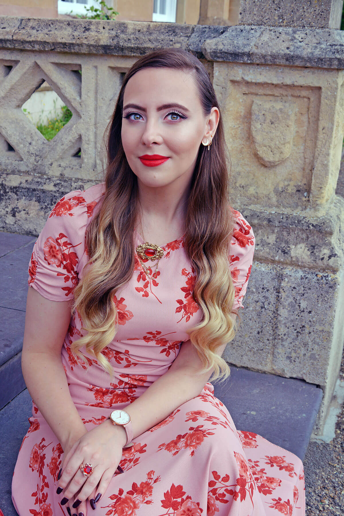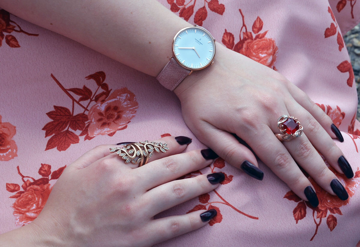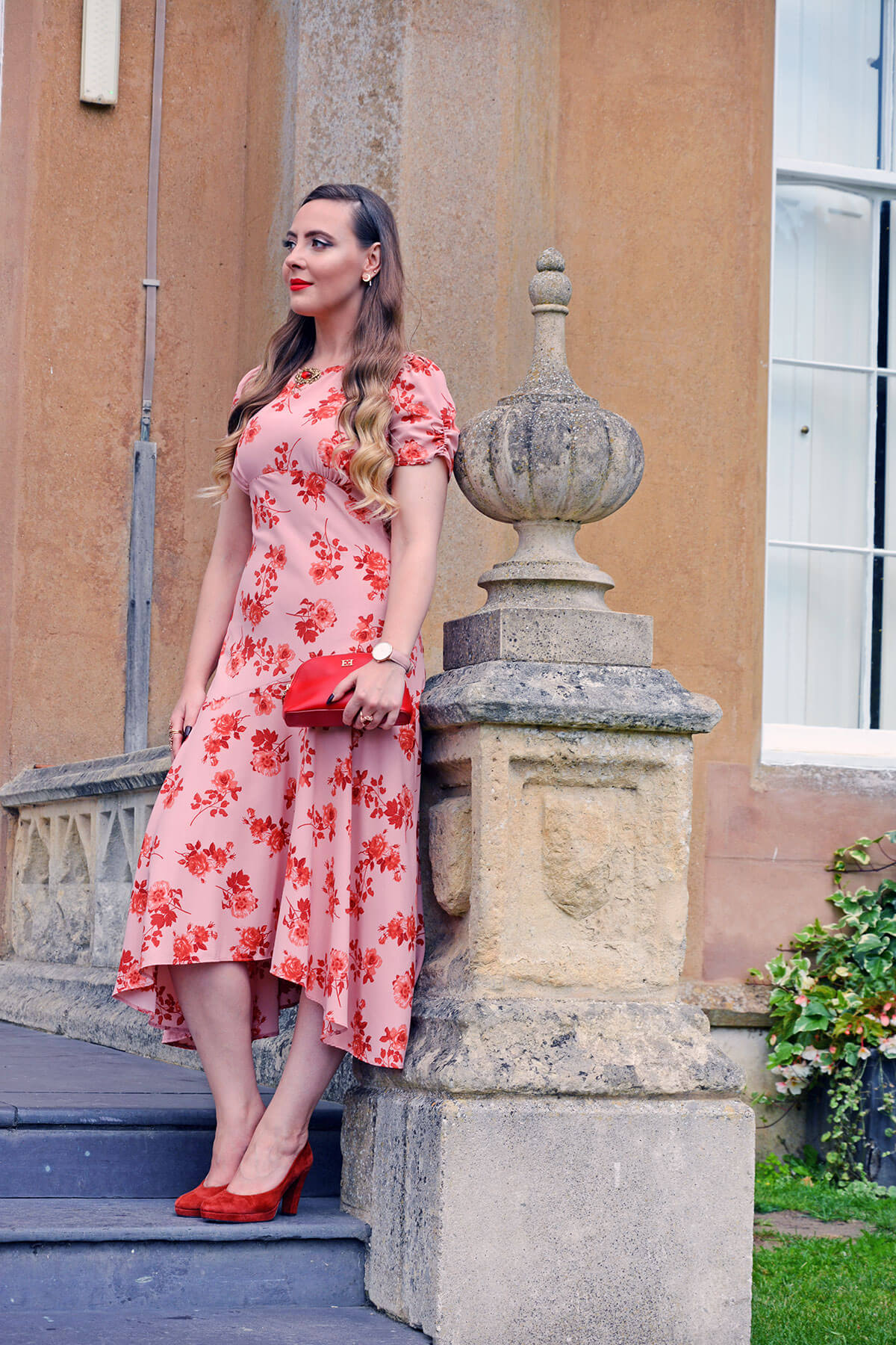 Clutch Bag: Escada, Heels: Pedro Miralles, Brooch: Antique Family Heirloom (Costume), Gold Plated Sterling Silver Lab Ruby Ring: Juelia, Gold Plated Sterling Silver Floral Ring: Thomas Sabo, Watch: Nordgreen