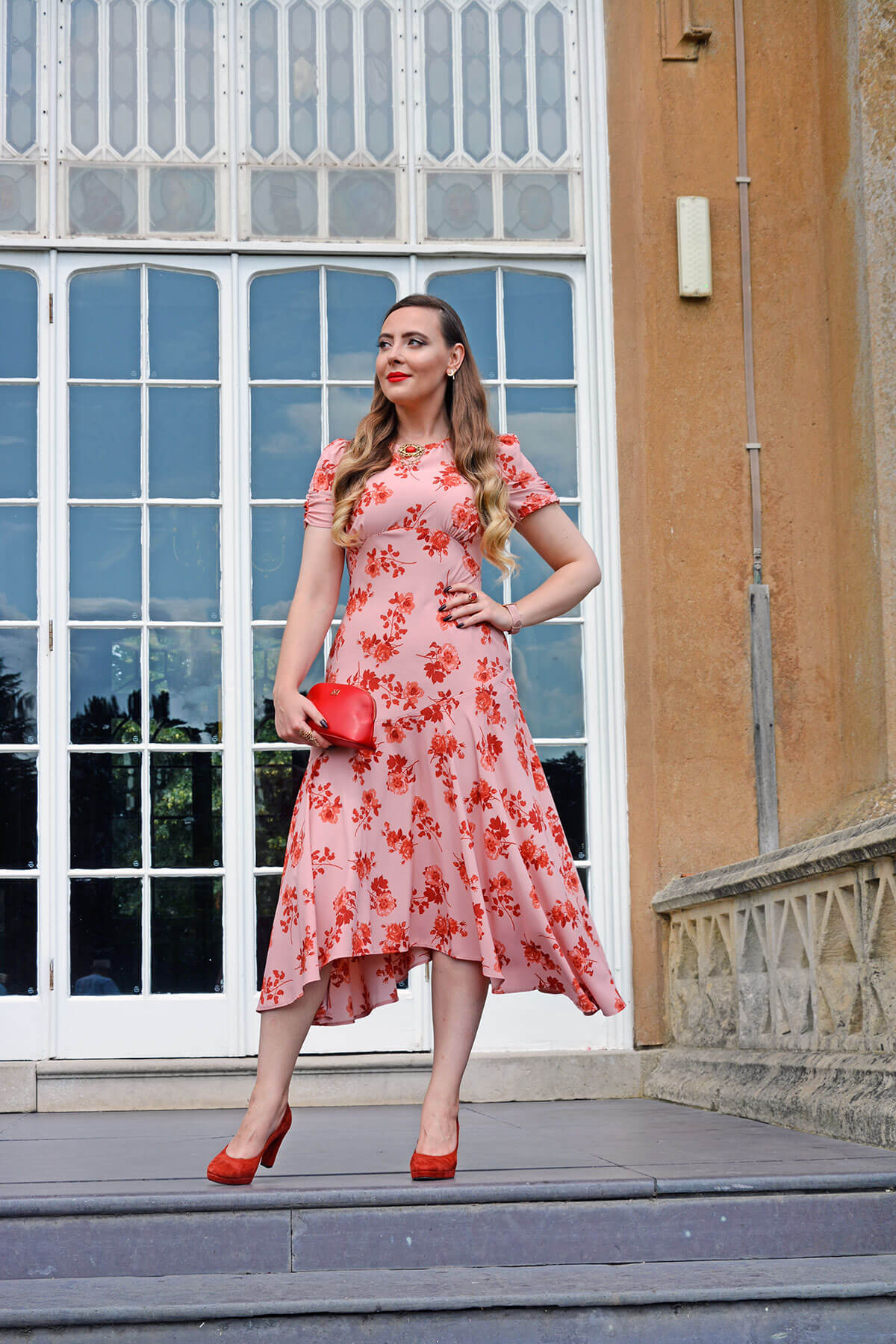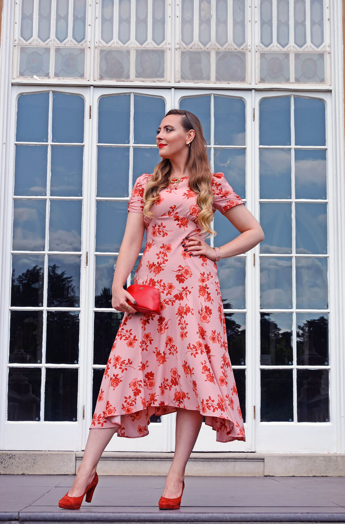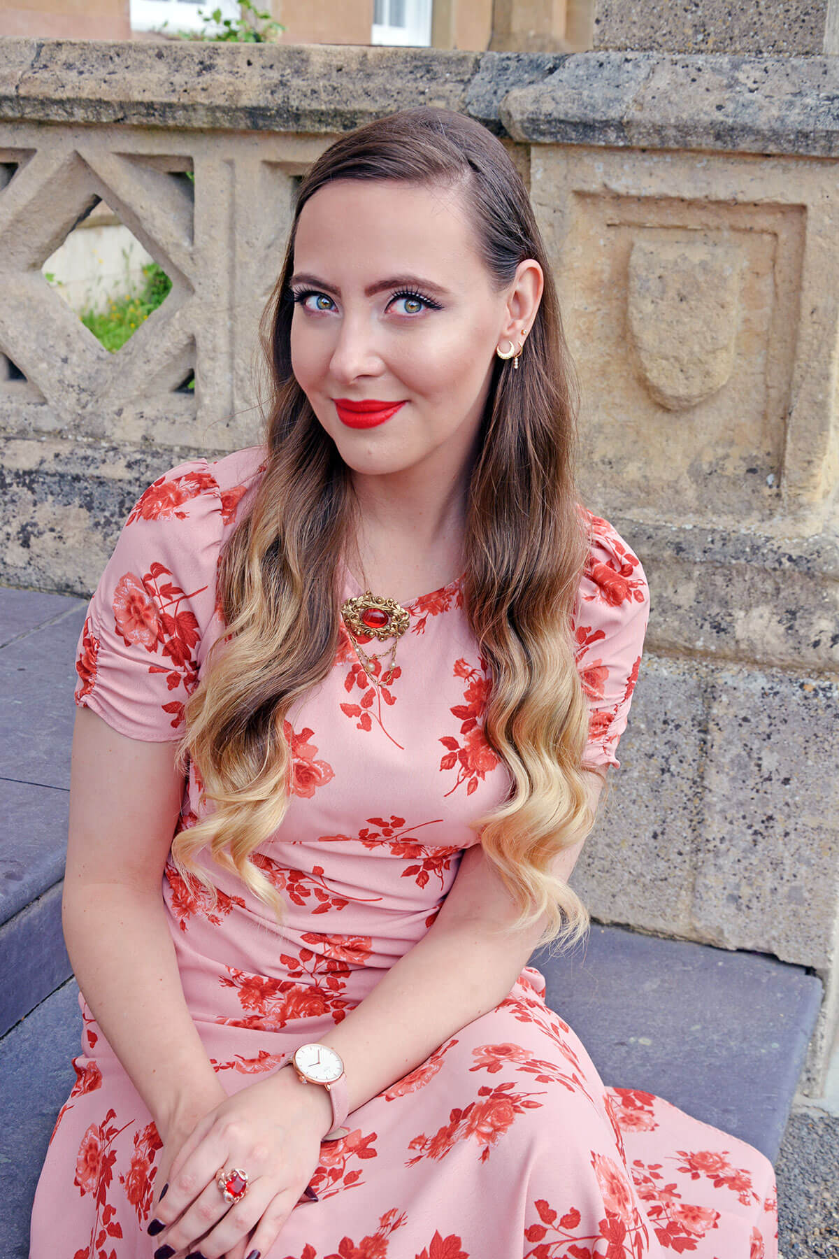Clutch Bag: Escada, Heels: Pedro Miralles, Brooch: Antique Family Heirloom (Costume), Gold Plated Sterling Silver Lab Ruby Ring: Juelia, Gold Plated Sterling Silver Floral Ring: Thomas Sabo, Watch: Nordgreen