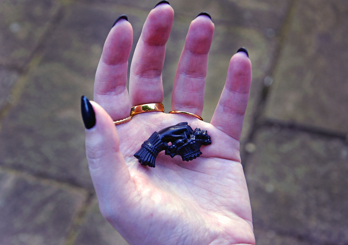 - Giving the colour black another dimension. As the dress code for women was particularly strict for the first couple of years of mourning, black gemstones and enamel rose to fame. Jet, Whitby jet in particular, skyrocketed in popularity as a relatively inexpensive mourning jewellery option. A step cheaper than jet would be vulcanite, glass or gutta percha, though jet was ultimately preferred. A carved hand brooch holding a bouquet of flowers or a fan is a very easily identifiable jet mourning jewellery example. Find out more about jet and other black gemstones here.