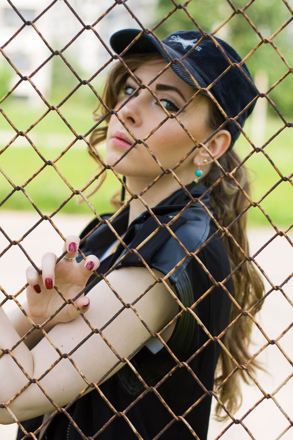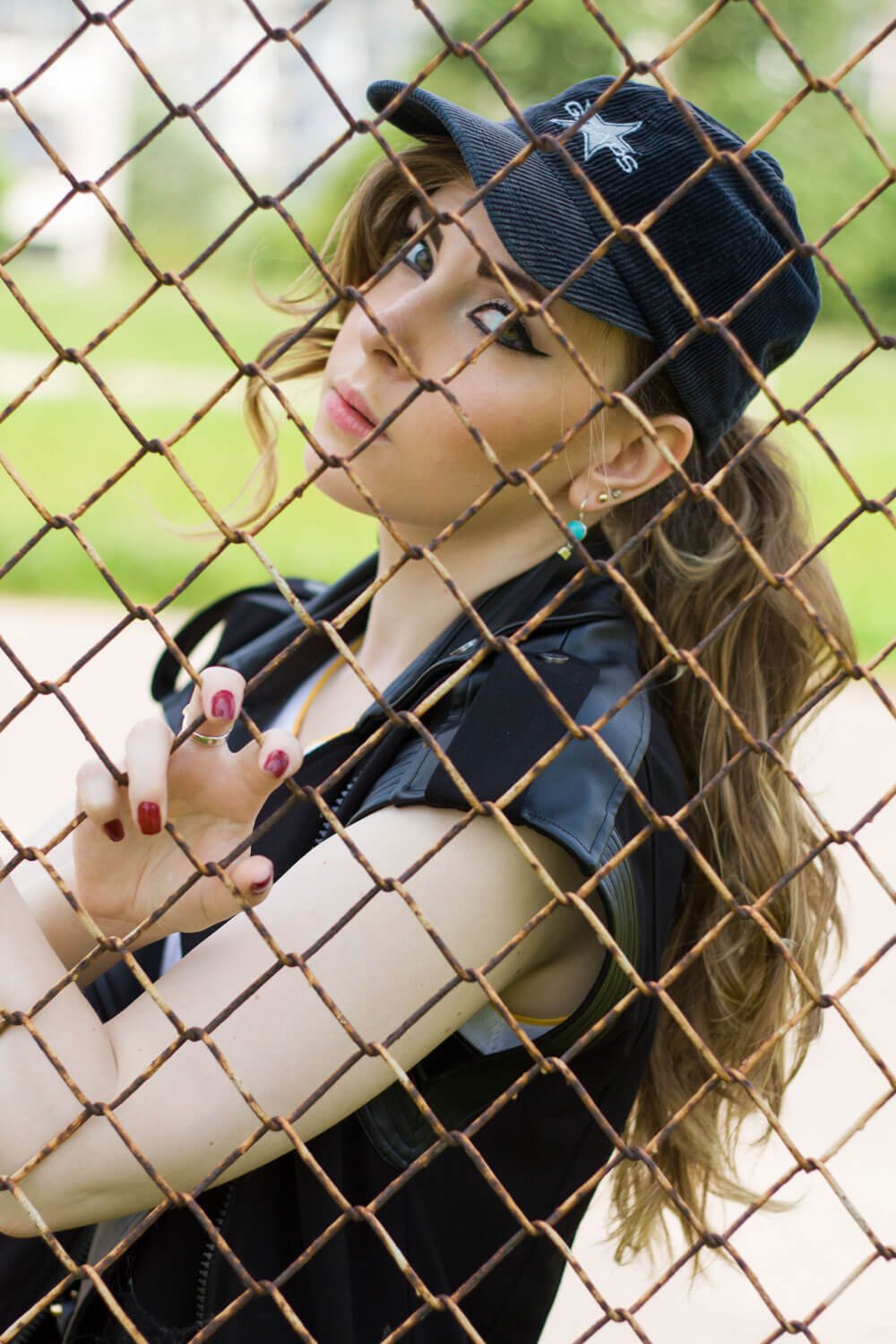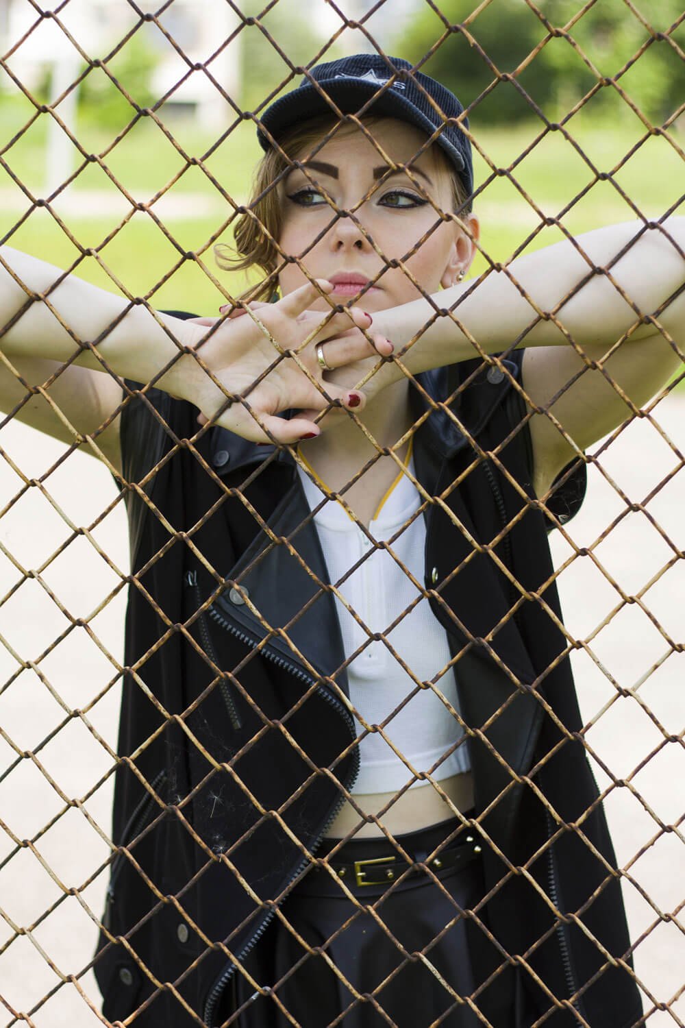 Top: Lacoste, Biker vest: Karl Lagerfeld, Skirt: Boohoo, Heels: Walter Steiger, Cap: Zara, Earrings: Freddie&Cinnamon